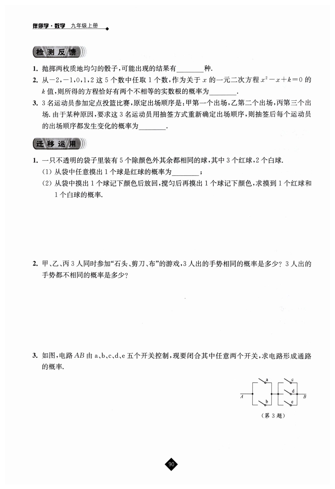 3. 通路事件數(shù):左側(a、b)選1個開關閉合,有 $ C_{2}^{1} = 2 $ 種方法;右側(c、d、e)選1個開關閉合,有 $ C_{3}^{1} = 3 $ 種方法。因此,通路的基本事件數(shù)為 $ C_{2}^{1} \times C_{3}^{1} = 2 \times 3 = 6 $ 種。 4. 概率計算:電路形成通路的概率 $ P = \frac{通路事件數(shù)}{基本事件總數(shù)} = \frac{6}{10} = \frac{3}{5} 。$ 結論:電路形成通路的概率為 $ \frac{3}{5} 。$