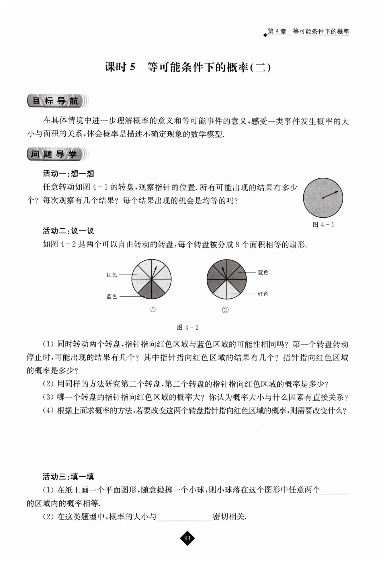 (3)第一個(gè)轉(zhuǎn)盤指針指向紅色區(qū)域的概率為3/8,第二個(gè)轉(zhuǎn)盤指針指向紅色區(qū)域的概率為5/8,5/8 > 3/8,因此第二個(gè)轉(zhuǎn)盤指針指向紅色區(qū)域的概率大。概率大小與轉(zhuǎn)盤中紅色區(qū)域面積和總區(qū)域面積的比值有直接關(guān)系。