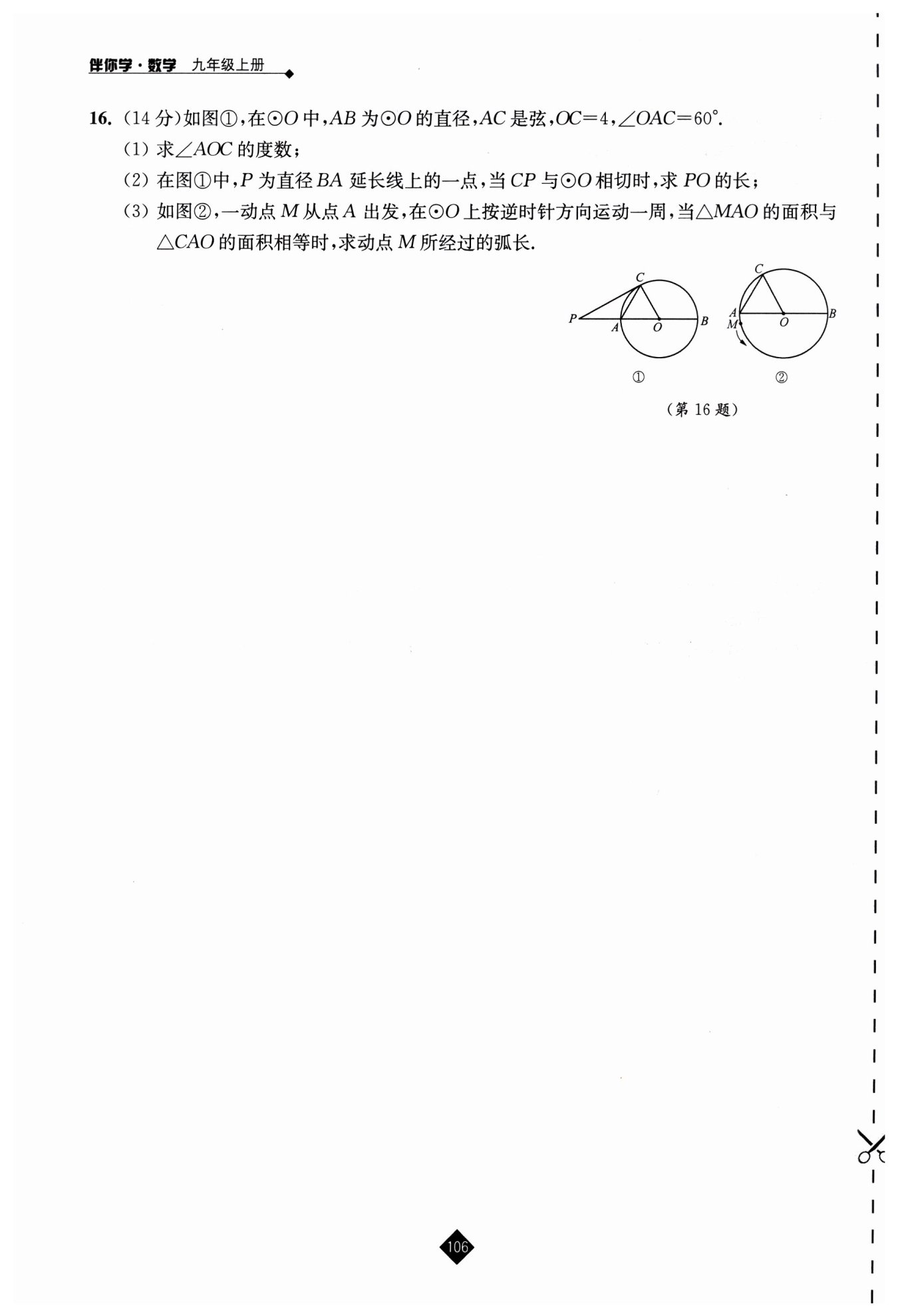 (1)知$\angle AOC=60^\circ,$則$\angle POC=180^\circ - 60^\circ=120^\circ$(平角定義)。在$Rt\triangle OCP$中,$\cos\angle POC=\frac{OC}{PO},$即$\cos120^\circ=\frac{4}{PO}。$因為$\cos120^\circ=-\frac{1}{2},$所以$-\frac{1}{2}=\frac{4}{PO},$解得$PO=-8$(長度不能為負,取絕對值),故$PO=8。$