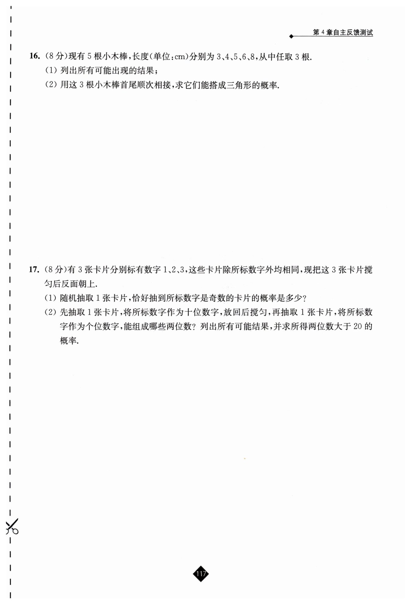 (2)能搭成三角形的結(jié)果:(3,4,5)、(3,4,6)、(3,5,6)、(3,6,8)、(4,5,6)、(4,5,8)、(4,6,8)、(5,6,8),共8種。