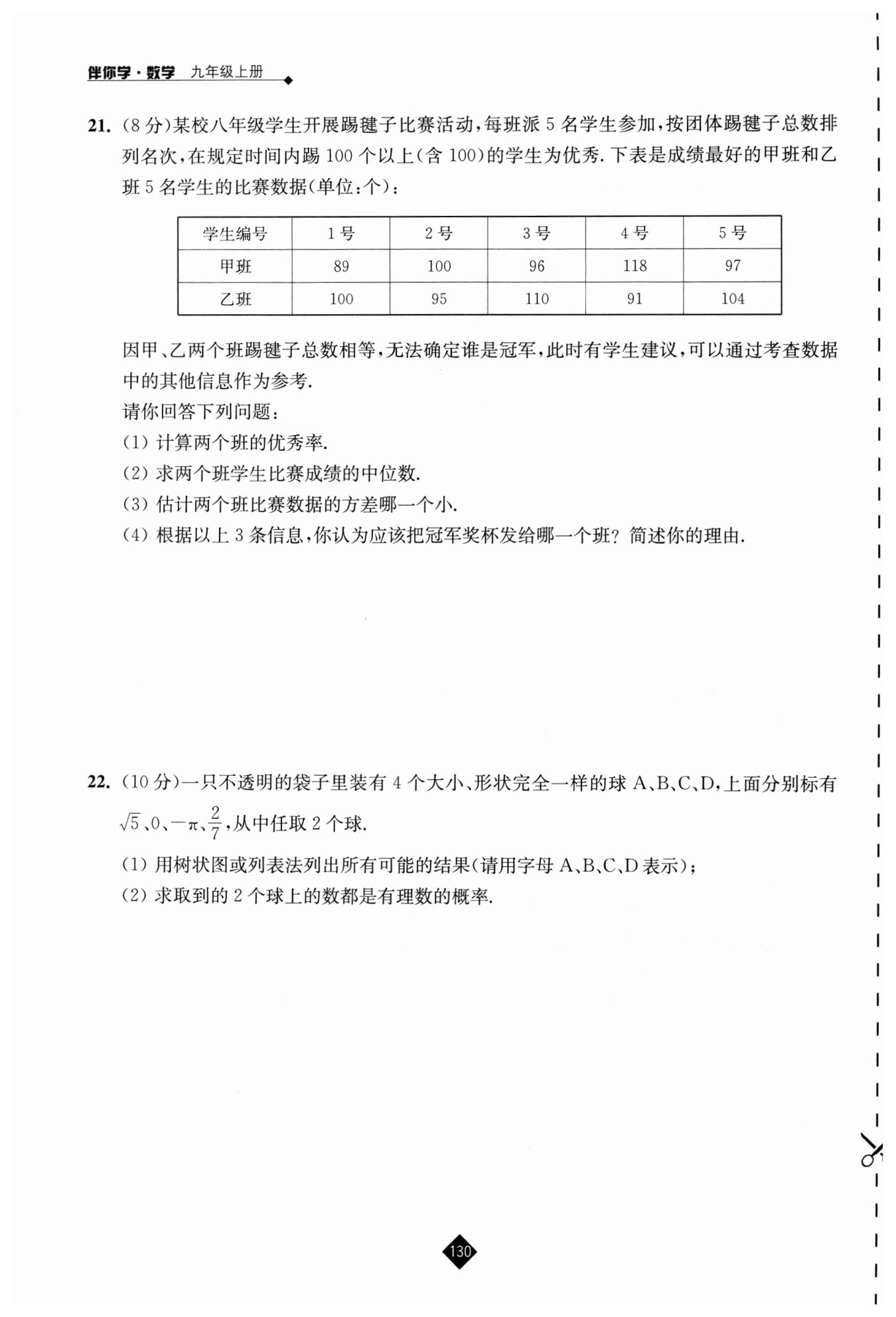 (1)甲班優(yōu)秀人數(shù)為2人(100,118),優(yōu)秀率為:$2\div5\times100\% = 40\%;$乙班優(yōu)秀人數(shù)為3人(100,110,104),優(yōu)秀率為:$3\div5\times100\% = 60\%。$ (2)甲班成績排序?yàn)?9,96,97,100,118,中位數(shù)為97;乙班成績排序?yàn)?1,95,100,104,110,中位數(shù)為100。