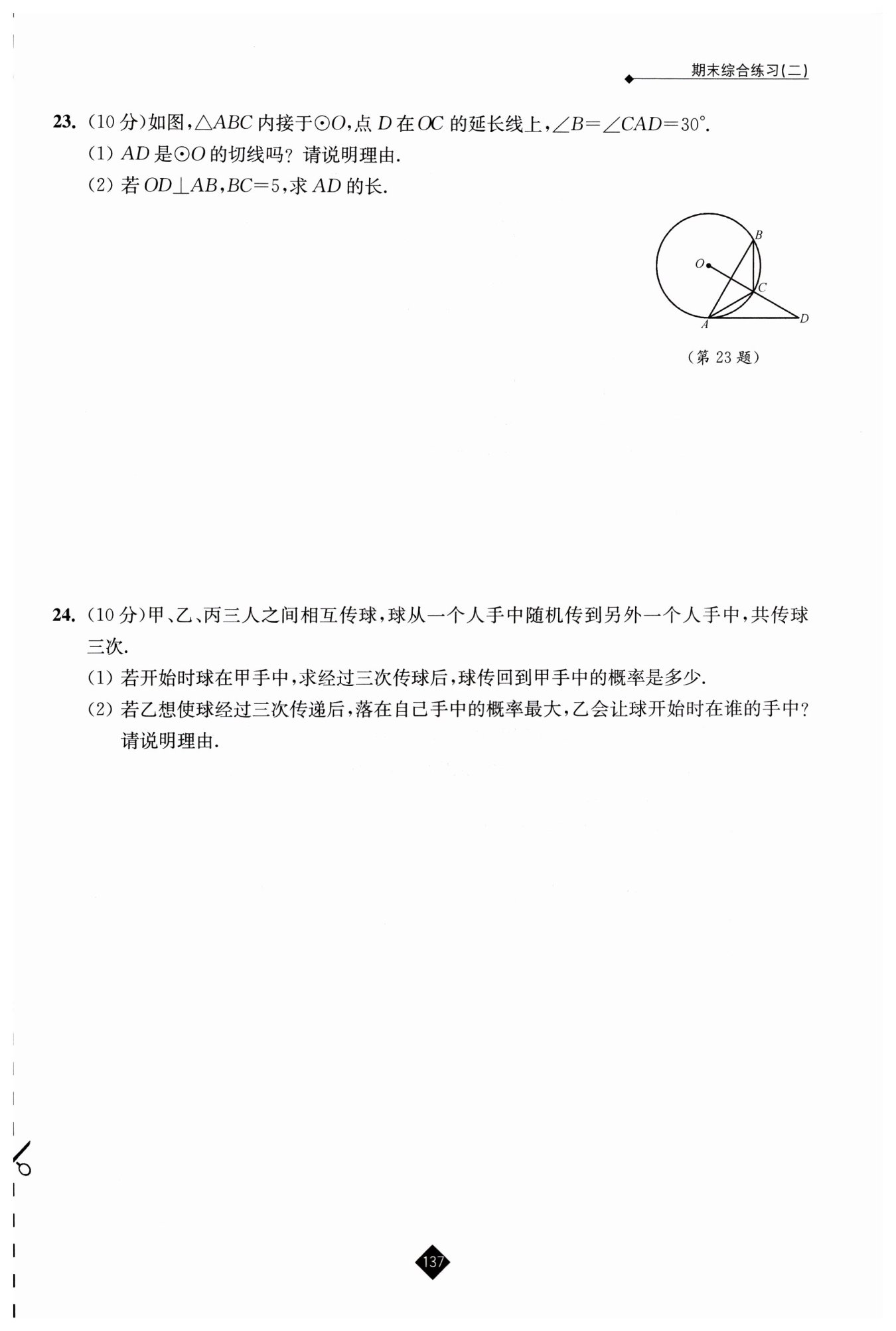 在$Rt\triangle AED$中,$\angle CAD = 30^{\circ},$$\angle EAD = \angle EAC + \angle CAD,$因為$\triangle AOC$是等邊三角形,$\angle OAC = 60^{\circ},$$OD \perp AB,$所以$\angle EAC = \frac{1}{2}\angle OAC = 30^{\circ}$(等腰三角形三線合一),則$\angle EAD = 30^{\circ} + 30^{\circ} = 60^{\circ},$所以$\angle D = 30^{\circ}。$