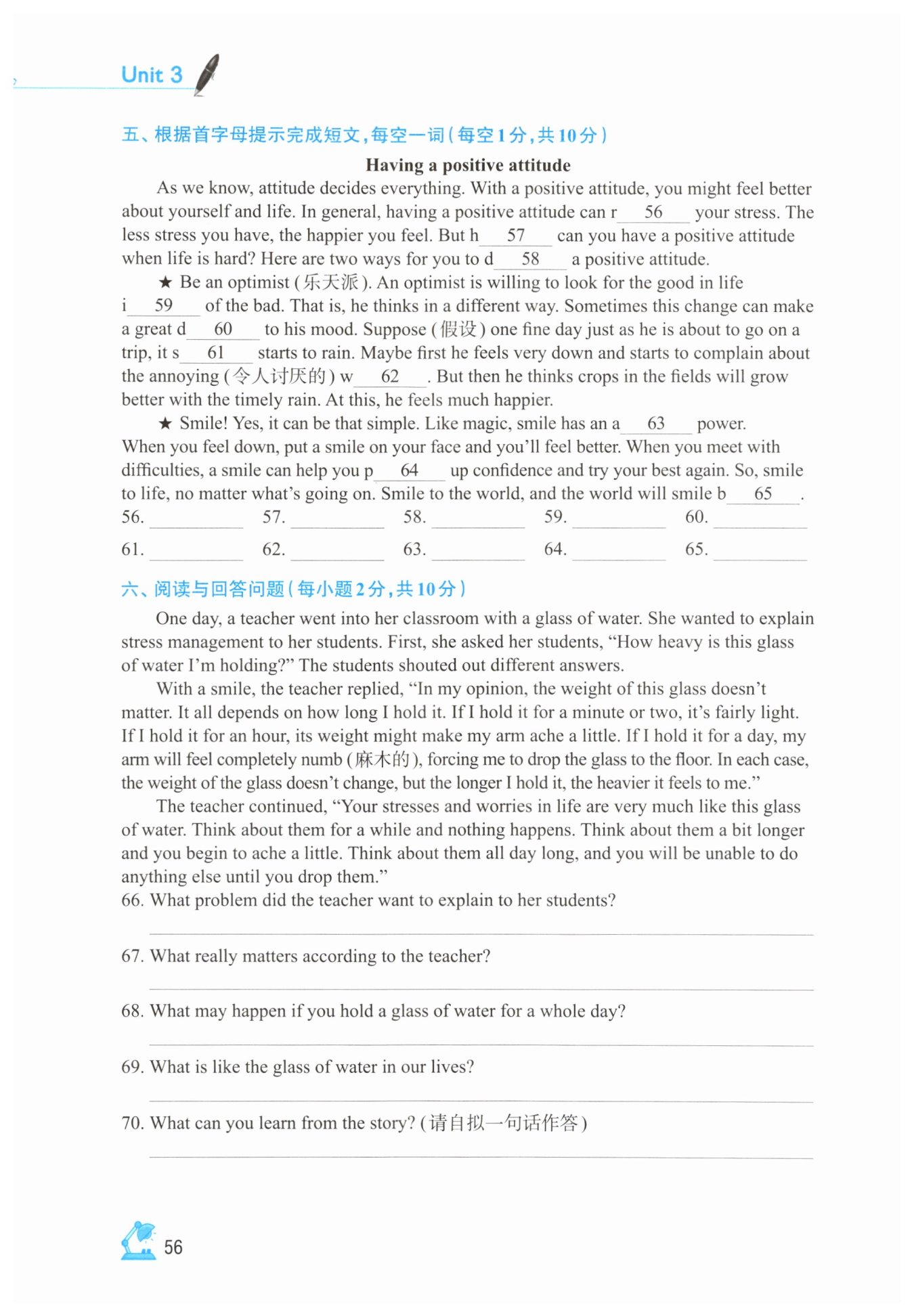 We should remember to put down our strcsses and worries./Thinking about our stresses and worries all the time is harmful to our body and mind.(言之有理即可)