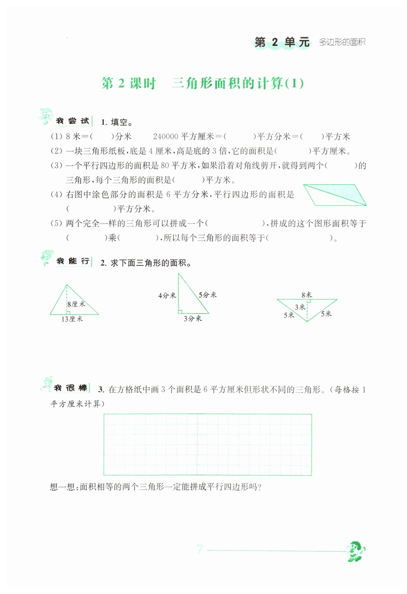(3) 平行四邊形沿對(duì)角線剪開得兩個(gè)完全一樣的三角形,每個(gè)面積是平行四邊形面積的一半,80÷2=40平方米。