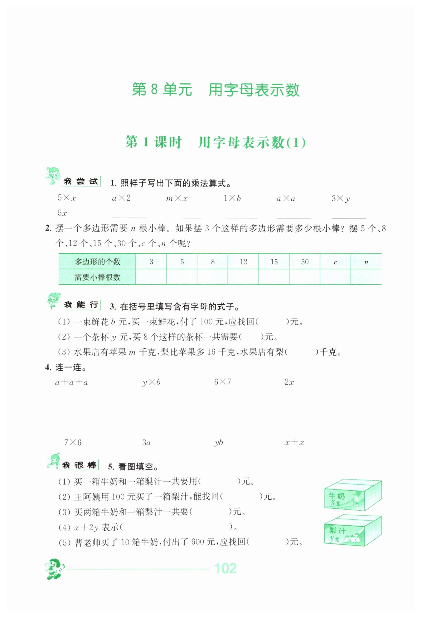 (1) 一箱牛奶的價(jià)格是$x$元,一箱梨汁的價(jià)格是$y$元,所以買一箱牛奶和一箱梨汁一共要用$x + y$元。