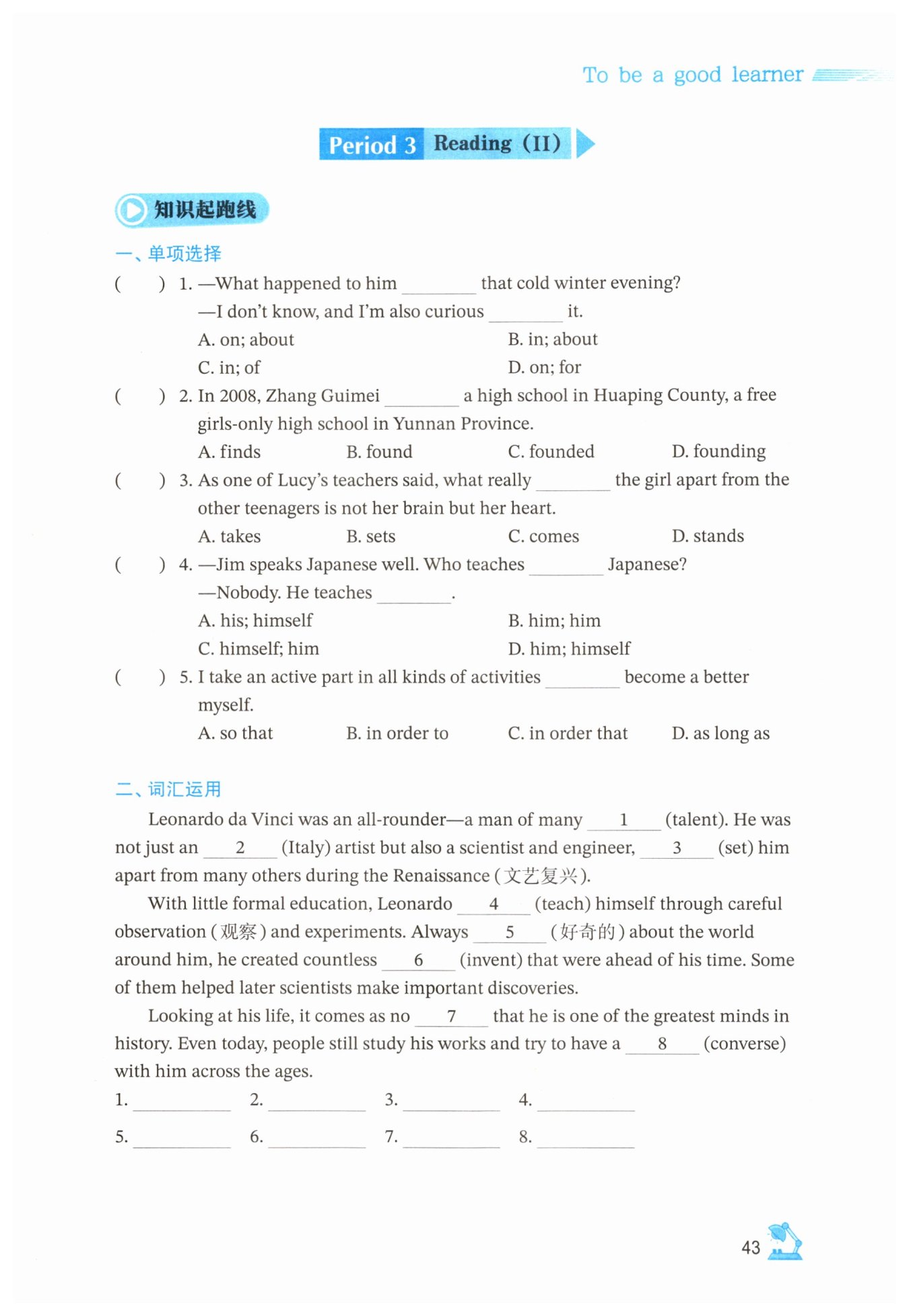 1. talents 2. Italian 3. setting 4. taught 5. curious 6. inventions 7. surprise 8. conversation