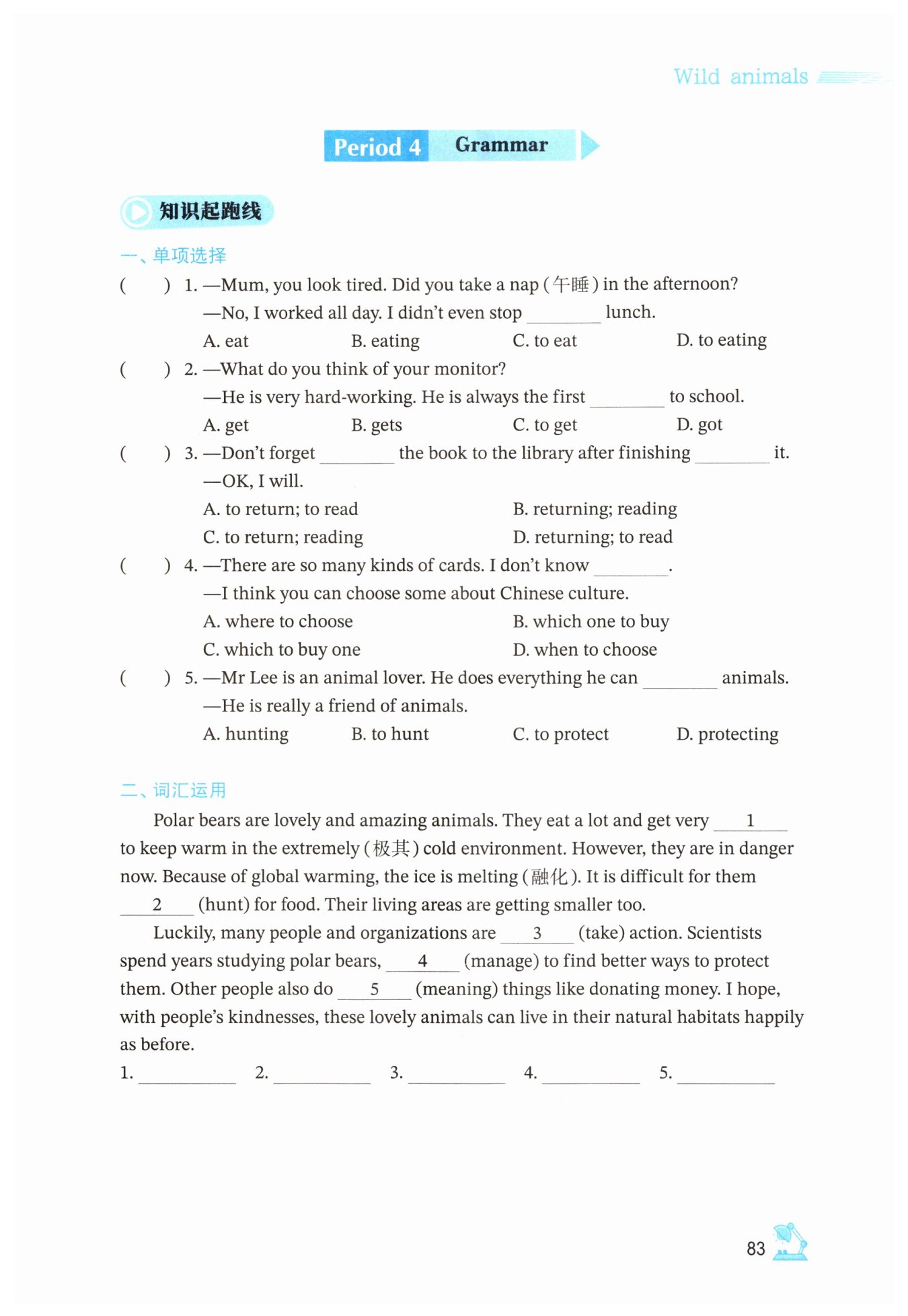 1. fat 2. to hunt 3. taking 4. managing 5. meaningful