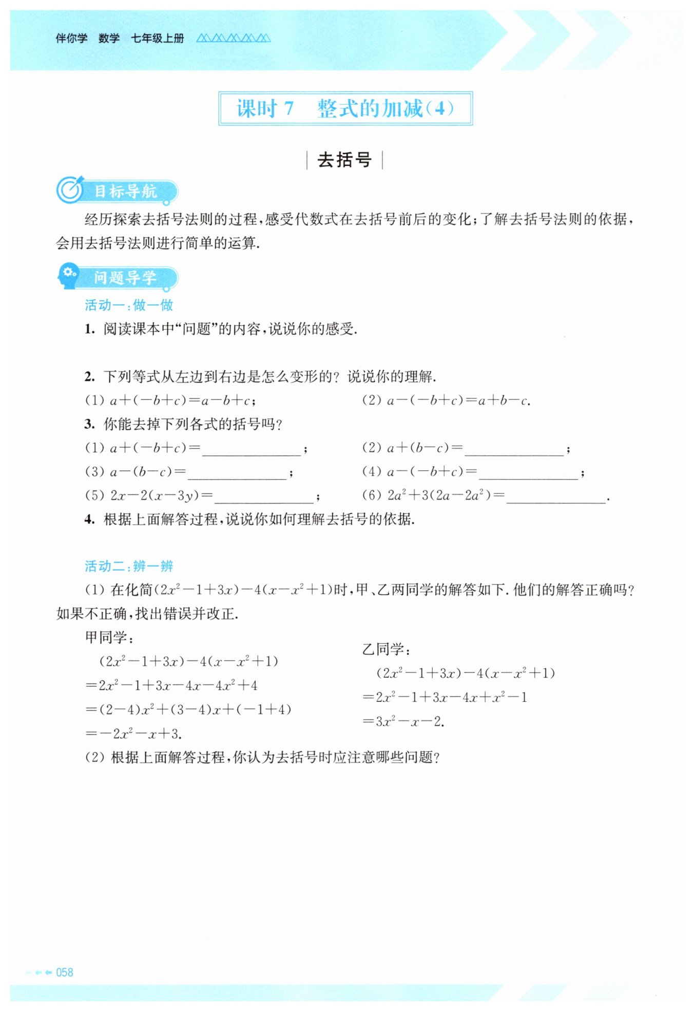 1. 閱讀課本中“問題”的內(nèi)容后,可以感受到整式的加減在實(shí)際問題中的應(yīng)用,以及去括號(hào)在整式加減中的重要性。