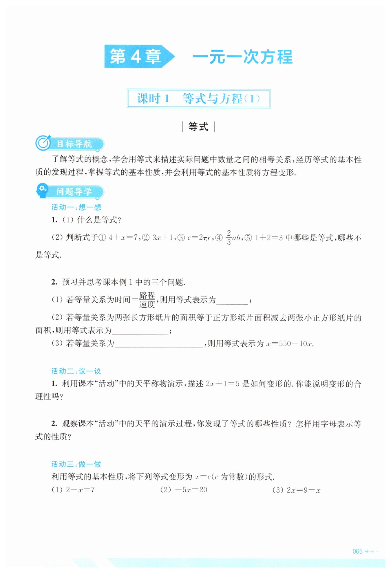 等式兩邊都加上(或減去)同一個數(shù)或整式,所得結(jié)果仍是等式,字母表示為:如果$a = b,$那么$a \pm m = b \pm m;$等式兩邊都乘(或除以)同一個數(shù)(除數(shù)不能為0),所得結(jié)果仍是等式,字母表示為:如果$a = b,$那么$am = bm;$如果$a = b,$那么$\frac{a}{m} = \frac{m}$($m \neq 0$)。