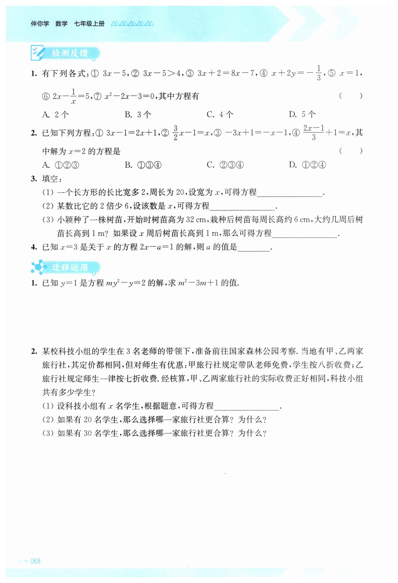 對(duì)于方程 $3x - 2 = 4x - 3$,