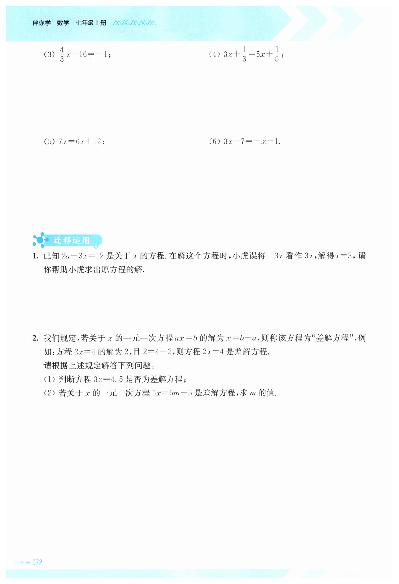 (1) 解:解方程 $3x = 4.5,$得 $x = \frac{4.5}{3} = 1.5。$計算 $b - a = 4.5 - 3 = 1.5,$因為 $x = 1.5$ 且 $b - a = 1.5,$所以 $x = b - a,$方程 $3x = 4.5$ 是差解方程。