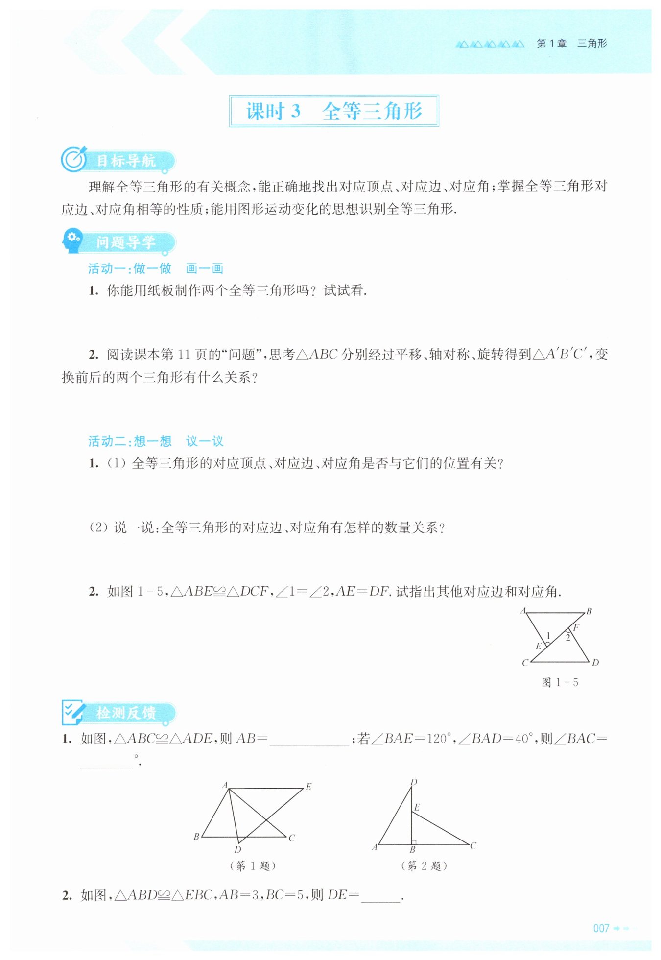 1.(1)是,全等三角形的對應(yīng)頂點(diǎn)、對應(yīng)邊、對應(yīng)角與它們的位置有關(guān),由全等三角形的表示方法確定對應(yīng)關(guān)系。