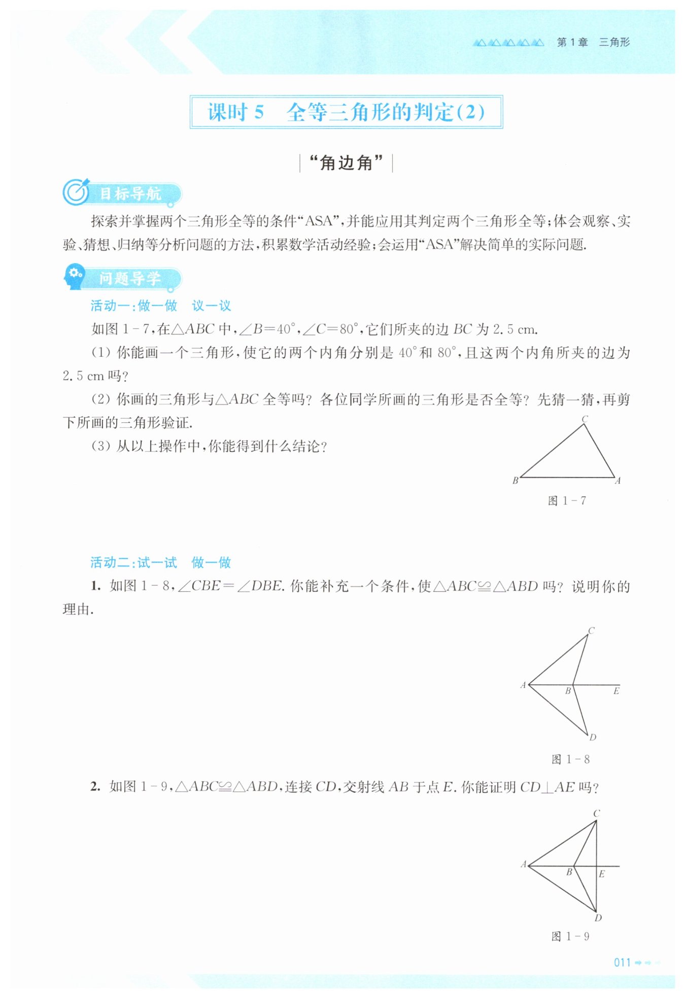 (3)結(jié)論:兩角及其夾邊分別相等的兩個(gè)三角形全等(簡(jiǎn)寫成“角邊角”或“ASA”)。