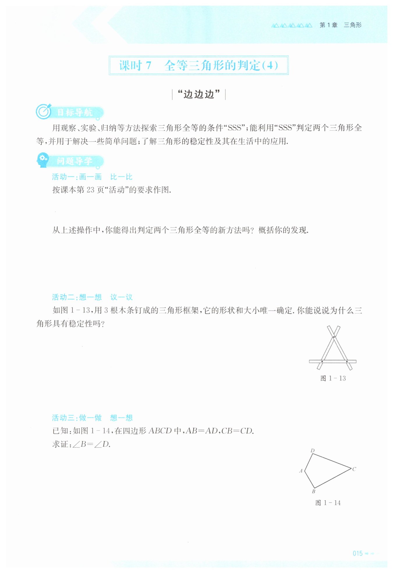 假設(shè)三角形三條邊長度確定,分別為$a,$$b,$$c。$根據(jù)“邊邊邊”(SSS)全等判定定理:三邊對應(yīng)相等的兩個三角形全等。對于任意一個三條邊長度分別為$a,$$b,$$c$的三角形,若存在另一個三角形,它的三條邊長度也分別為$a,$$b,$$c,$那么這兩個三角形全等,即它們的形狀和大小完全相同。所以,當(dāng)三角形三邊的長度確定時,三角形的形狀和大小就被唯一確定了,這就是三角形具有穩(wěn)定性的原因。