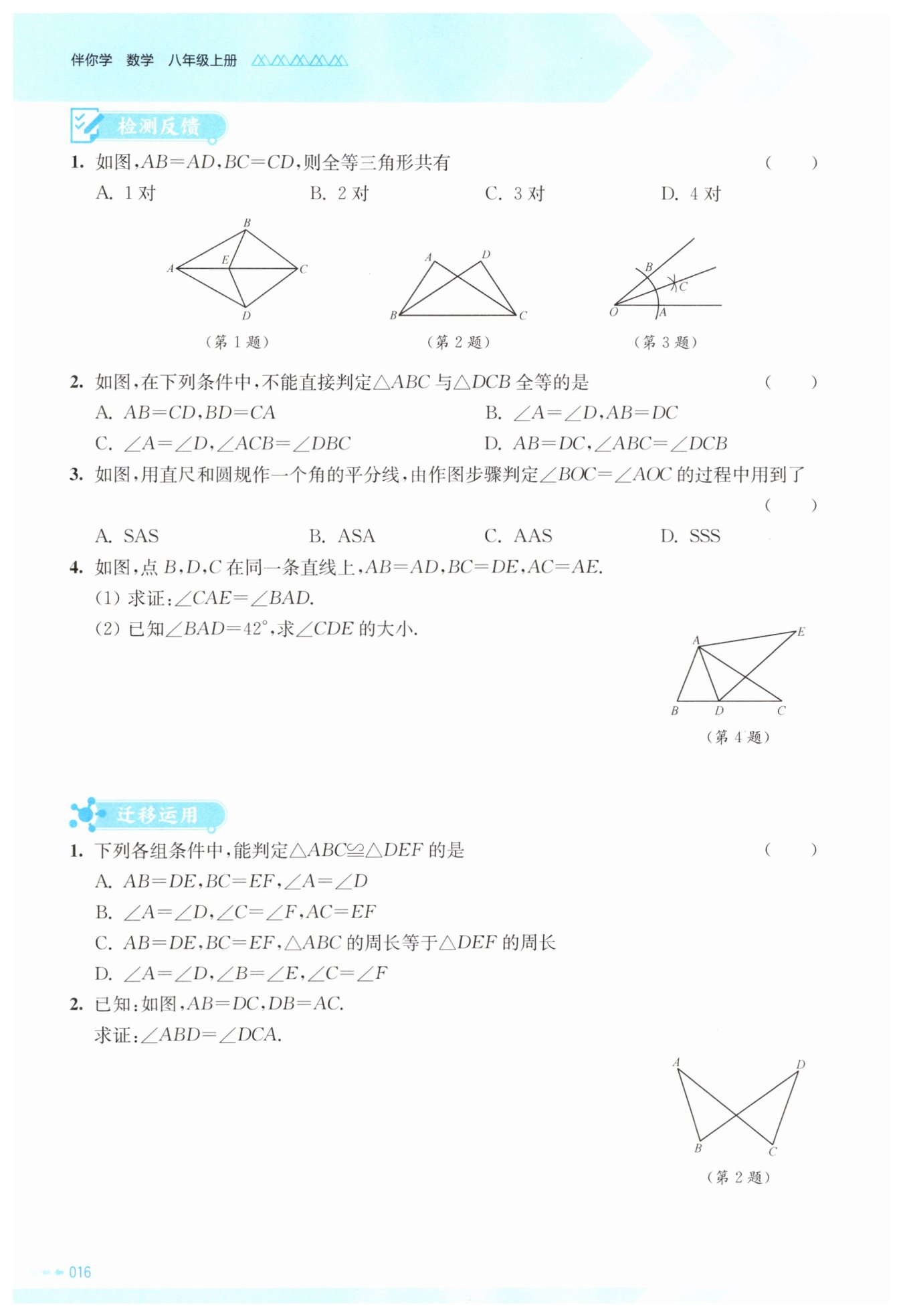 所以全等三角形有$\bigtriangleup ABC\cong\bigtriangleup ADC$,$\bigtriangleup ABE\cong\bigtriangleup ADE$,$\bigtriangleup BCE\cong\bigtriangleup DCE$,共$3$對(duì)。