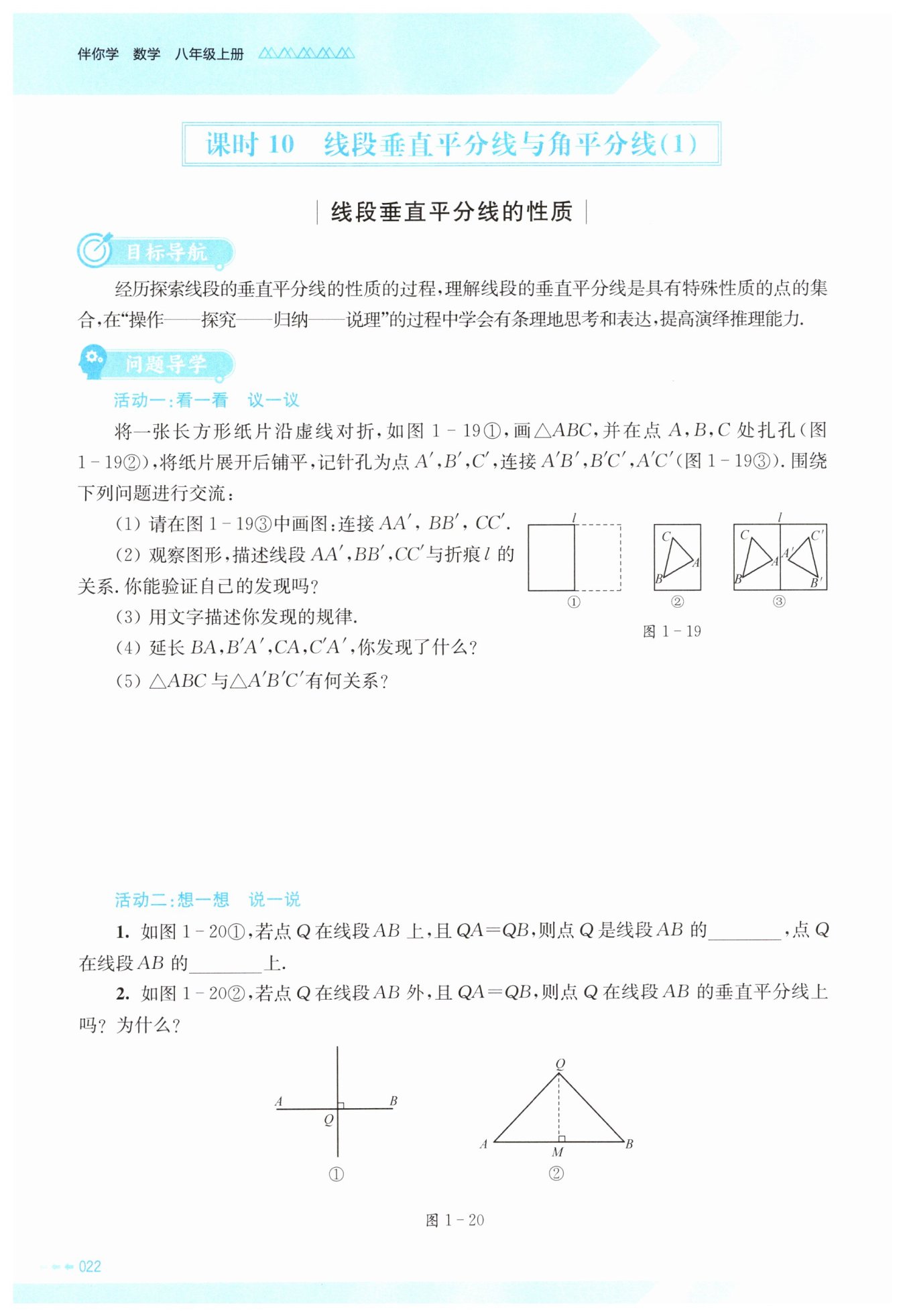 (1)按要求連接線段AA',BB',CC';(2)因紙片沿折痕l對折,A與A'、B與B'、C與C'為對稱點(diǎn),對稱點(diǎn)連線被對稱軸垂直平分,故AA',BB',CC'均被l垂直平分,可通過測量交點(diǎn)為中點(diǎn)及夾角90°驗(yàn)證;(3)歸納對稱點(diǎn)連線與對稱軸關(guān)系;(4)對應(yīng)線段BA與B'A'、CA與C'A'關(guān)于l對稱,延長后交點(diǎn)在l上;(5)折疊后對應(yīng)點(diǎn)重合,兩三角形關(guān)于l對稱且全等。