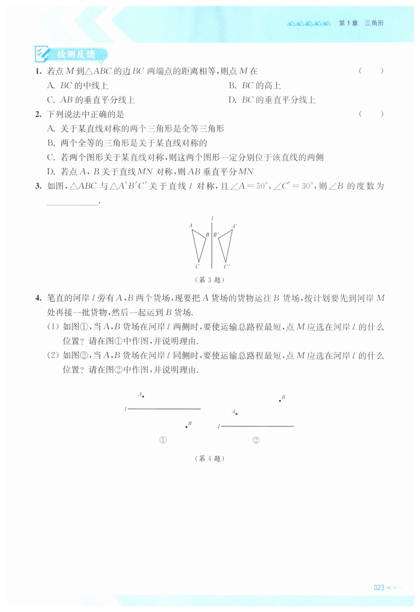 A. 關于某直線對稱的兩個三角形是全等三角形。這是正確的,因為如果兩個三角形關于某條直線對稱,則它們的所有對應邊和對應角都相等,滿足全等三角形的條件。