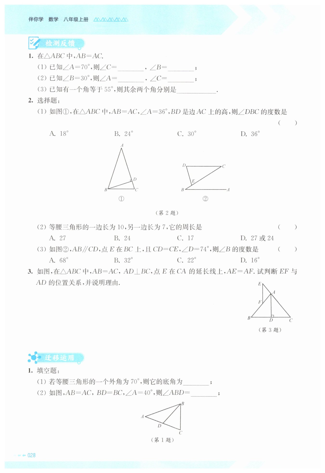 (3)當(dāng)$BD = CD$時,由于等腰三角形三線合一,所以$AD$是底邊中線,同時也是頂角平分線和底邊上的高,即$\angle BAD=\angle CAD$,$AD\perp BC$。