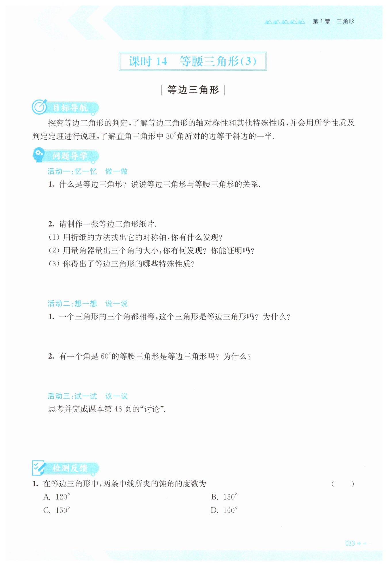 1. 一個(gè)三角形的三個(gè)角都相等, 由于三角形內(nèi)角和為$180^\circ$,所以每個(gè)角都是$60^\circ$。根據(jù)等邊三角形的性質(zhì),三個(gè)角都相等的三角形是等邊三角形。