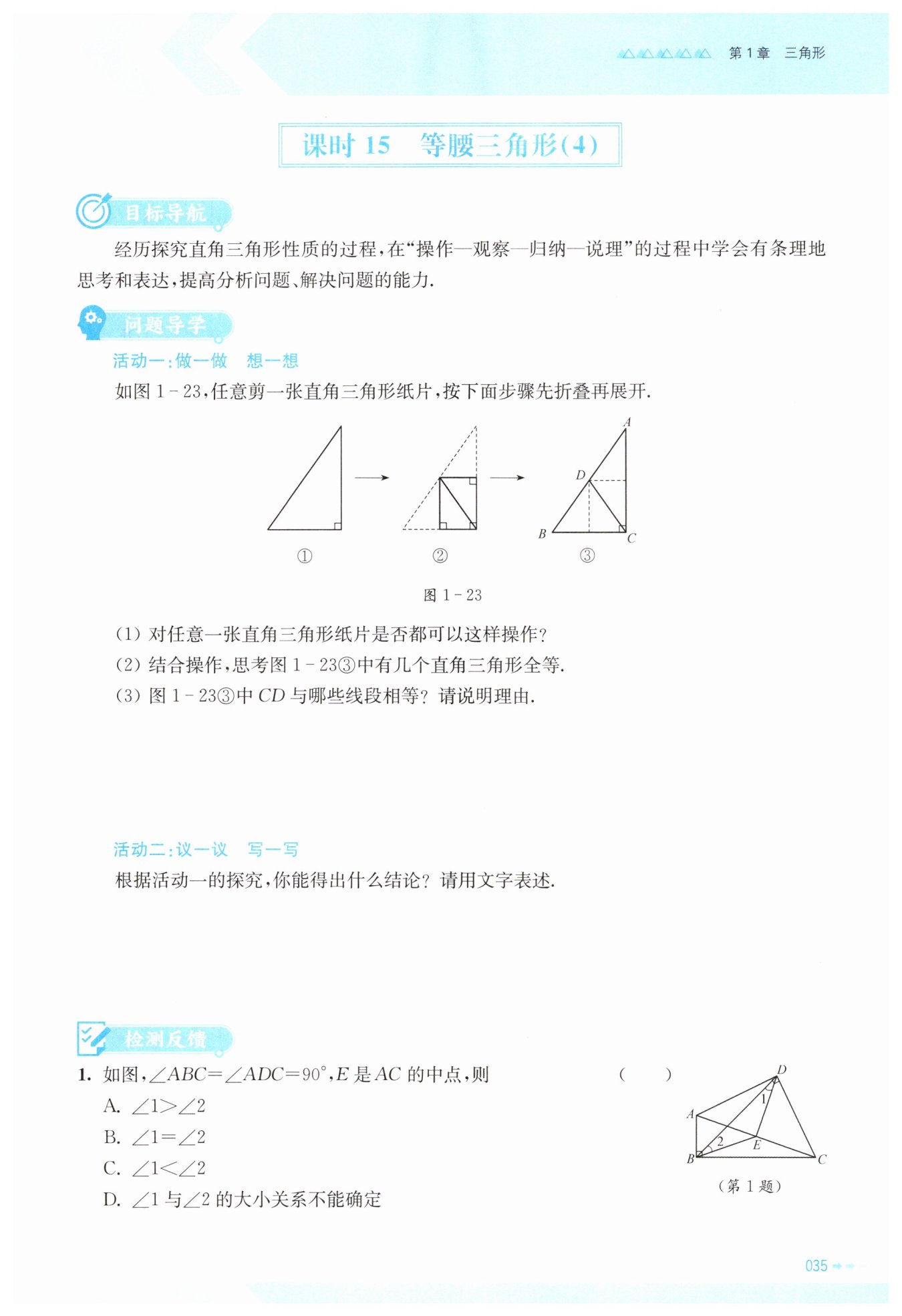 (3) 在圖1-23③中,CD是直角三角形$\triangle ACD$和$\triangle BCD$的公共邊。由于$\triangle ACD \cong \triangle BCD$,所以CD=BD,CD=AD,因此CD=AD=BD。