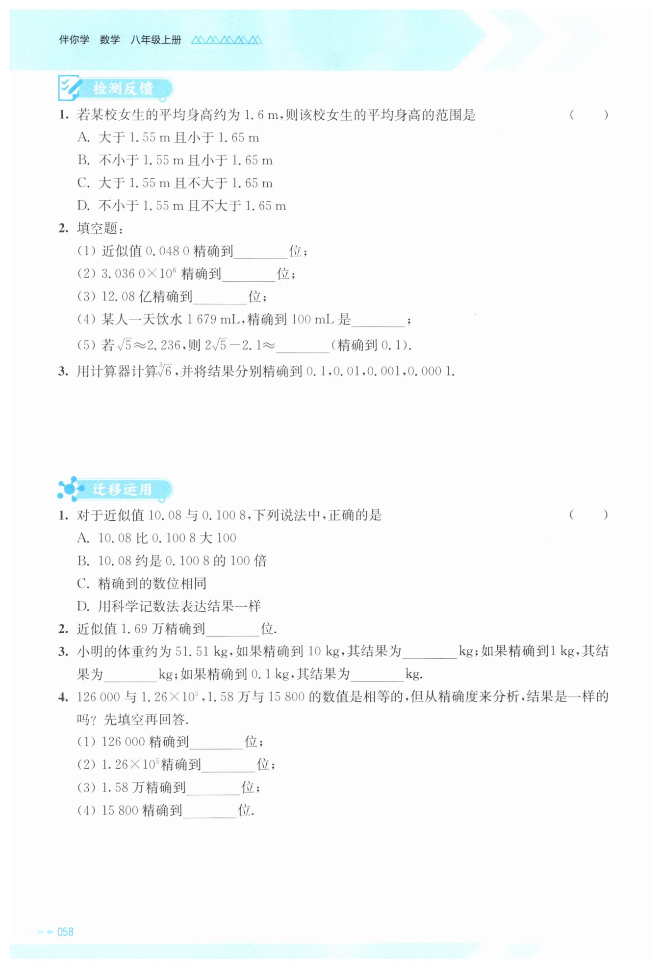 5. 有區(qū)別;精確度不同(0.1精確到十分位,0.10精確到百分位);有效數(shù)字不同(0.1有1個(gè)有效數(shù)字,0.10有2個(gè));舉例:0.095≈0.1(精確到十分位),0.0995≈0.10(精確到百分位)。