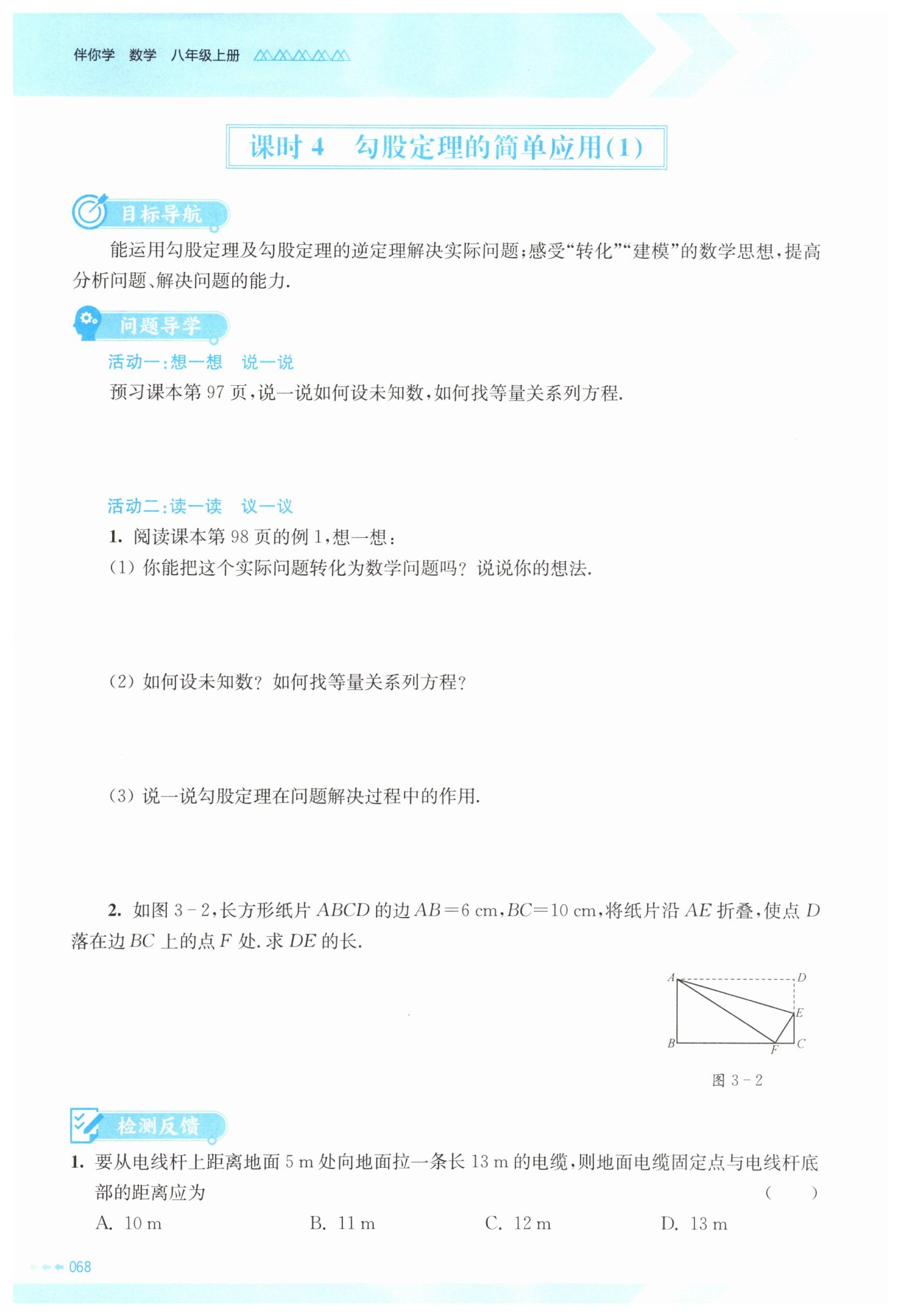 在運用勾股定理解決實際問題時,設(shè)未知數(shù)通常設(shè)題目中所求的未知量為$x$(或其他字母),若所求量較復(fù)雜,可設(shè)與所求量相關(guān)的中間量為未知數(shù)。找等量關(guān)系的關(guān)鍵是根據(jù)題意找出直角三角形,利用勾股定理“直角三角形兩直角邊的平方和等于斜邊的平方”作為等量關(guān)系,即若直角邊為$a$、$b$,斜邊為$c$,則$a^2 + b^2 = c^2$,將已知量和所設(shè)未知數(shù)代入該等式列方程。
