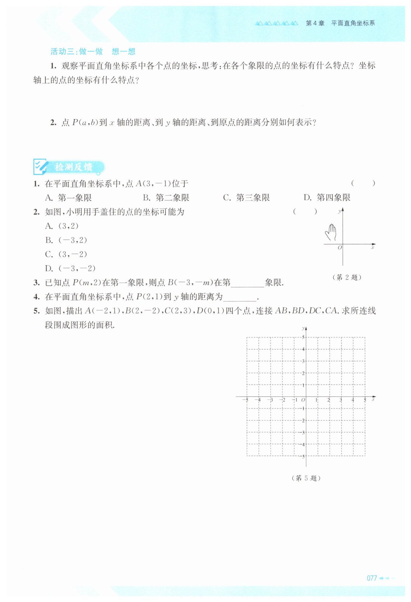 【答案】: 點(diǎn)P(a,b)和點(diǎn)Q(b,a)一般不是同一個(gè)點(diǎn);點(diǎn)A在第一象限,點(diǎn)B在第二象限,點(diǎn)C在第三象限,點(diǎn)D在第四象限。