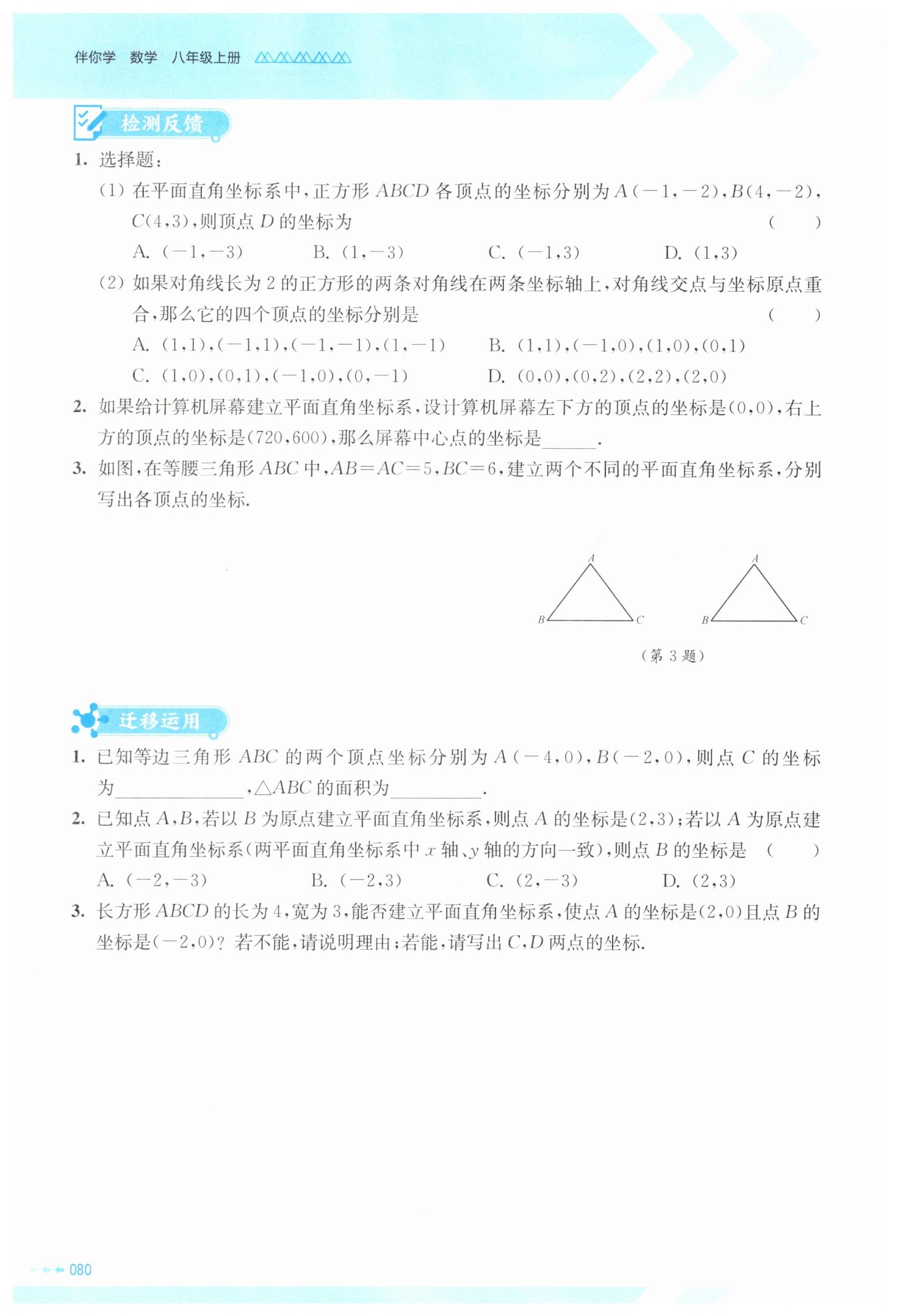 【解析】: (1)選擇以點(diǎn)A為原點(diǎn),AB為x軸,AD為y軸建立平面直角坐標(biāo)系。則頂點(diǎn)坐標(biāo)為:A(0,0),B(4,0),C(4,4),D(0,4)。 (2)可以選擇不同的平面直角坐標(biāo)系,例如以正方形中心為原點(diǎn),平行于邊的方向?yàn)樽鴺?biāo)軸。 設(shè)正方形中心為原點(diǎn),則頂點(diǎn)坐標(biāo)為:A(-2,-2),B(2,-2),C(2,2),D(-2,2)。 (3)已知A(1,1),B(5,1),可以確定AB為水平線段,長(zhǎng)度為4。 可以建立平面直角坐標(biāo)系,以A點(diǎn)為(1,1),B點(diǎn)為(5,1)。 C點(diǎn)坐標(biāo)為(5,5),D點(diǎn)坐標(biāo)為(1,5)。