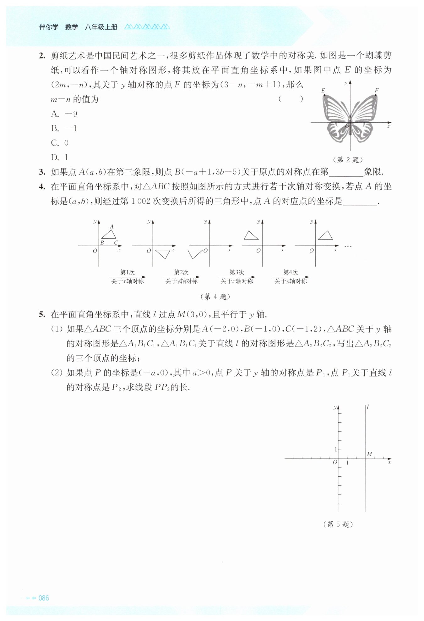 【解析】: (1) ∵△ABC關(guān)于y軸對稱得△A?B?C?,關(guān)于y軸對稱的點(diǎn)橫坐標(biāo)互為相反數(shù),縱坐標(biāo)不變, ∴A(-2,0)→A?(2,0),B(-1,0)→B?(1,0),C(-1,2)→C?(1,2)。 ∵直線l:x=3,關(guān)于直線x=3對稱的點(diǎn)橫坐標(biāo)滿足x'=6-x,縱坐標(biāo)不變, ∴A?(2,0)→A?(6-2,0)=(4,0),B?(1,0)→B?(6-1,0)=(5,0),C?(1,2)→C?(6-1,2)=(5,2)。 故△A?B?C?的頂點(diǎn)坐標(biāo)為A?(4,0),B?(5,0),C?(5,2)。 (2) 點(diǎn)P(-a,0)關(guān)于y軸對稱得P?(a,0)。 P?(a,0)關(guān)于直線l:x=3對稱得P?(6-a,0)。 ∵P(-a,0),P?(6-a,0), ∴PP?=|(6-a)-(-a)|=|6|=6。