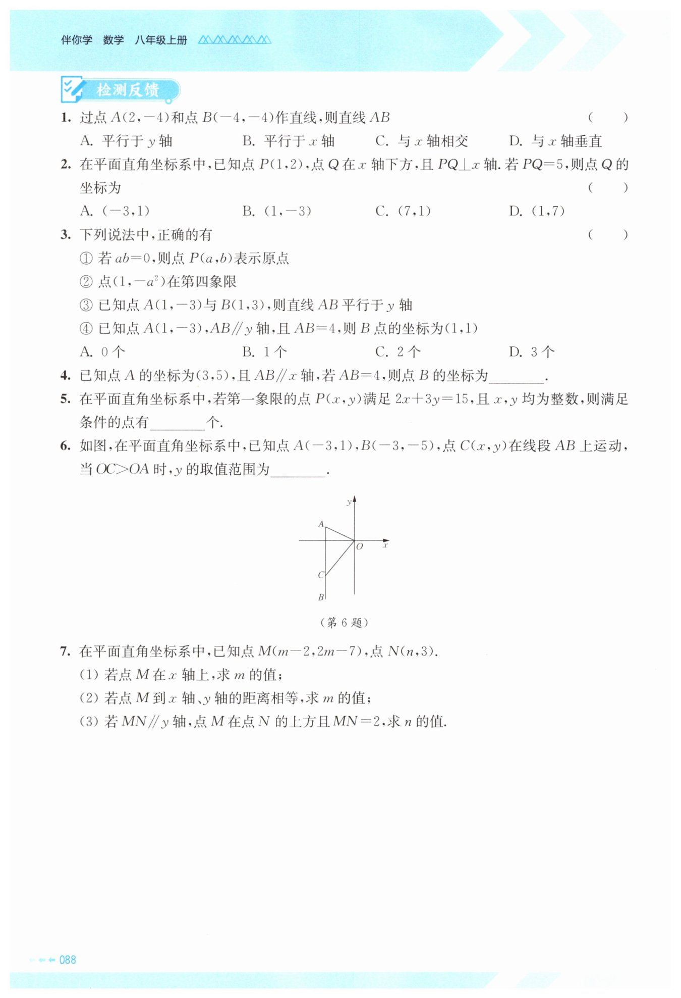 (3)因為$MN// y$軸,所以點$M$和點$N$的橫坐標(biāo)相等,即$m - 2 = n。$又因為點$M$在點$N$的上方且$MN = 2,$所以點$M$的縱坐標(biāo)減去點$N$的縱坐標(biāo)等于$2,$即$2m - 7 - 3 = 2,$解得$m = 6,$則$n = m - 2 = 6 - 2 = 4。$