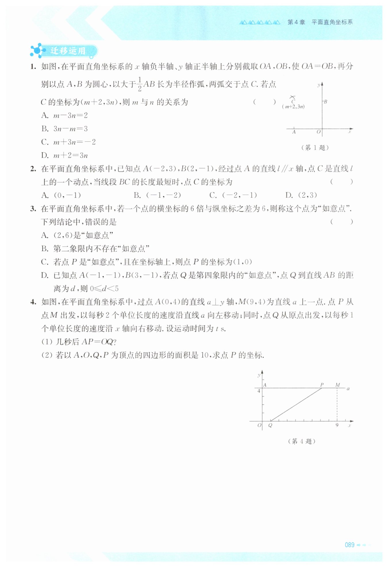 當(dāng)$t > 4.5$時,$2t - 9 + t = 5,$解得$t = \frac{14}{3},$此時點(diǎn)$P$的坐標(biāo)為$(9 - 2 \times \frac{14}{3}, 4) = (-\frac{1}{3}, 4)。$