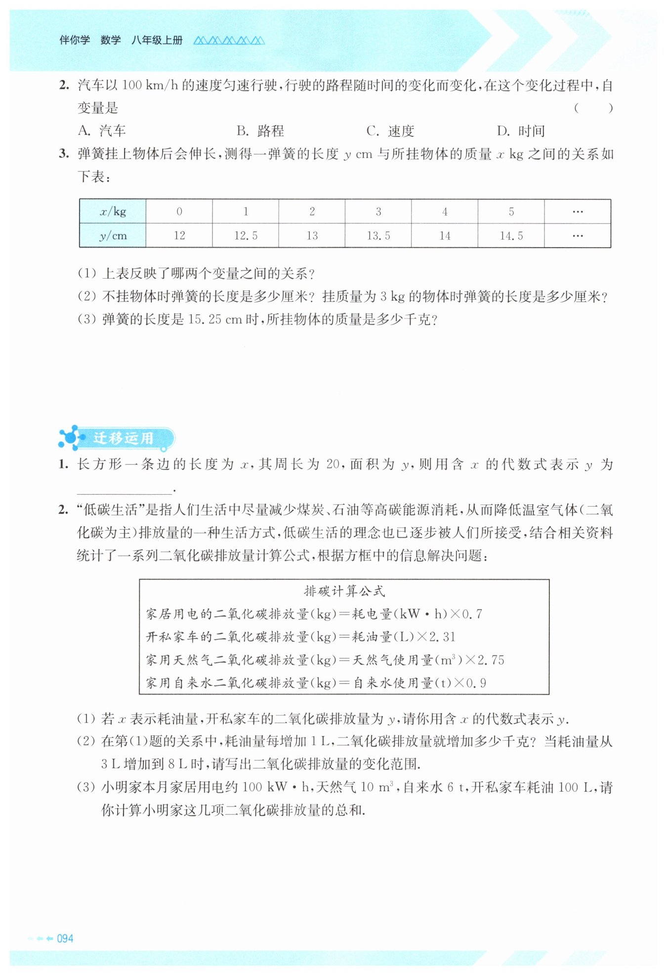 (2)由$y = 2.31x,$當(dāng)耗油量增加$1L$時,二氧化碳排放量增加$2.31kg。$當(dāng)$x = 3$時,$y = 2.31×3 = 6.93;$當(dāng)$x = 8$時,$y = 2.31×8 = 18.48。$所以,當(dāng)耗油量從$3L$增加到$8L$時,二氧化碳排放量的變化范圍為$6.93kg \leq y \leq 18.48kg。$