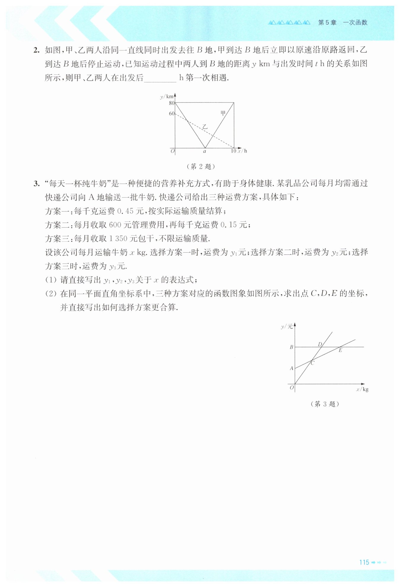由圖可知,甲從出發(fā)地到B地再返回,總路程160km(往返各80km),總時間10h,故甲的速度為160÷10=16km/h,單程時間為80÷16=5h,即甲5h到達(dá)B地(a=5)。