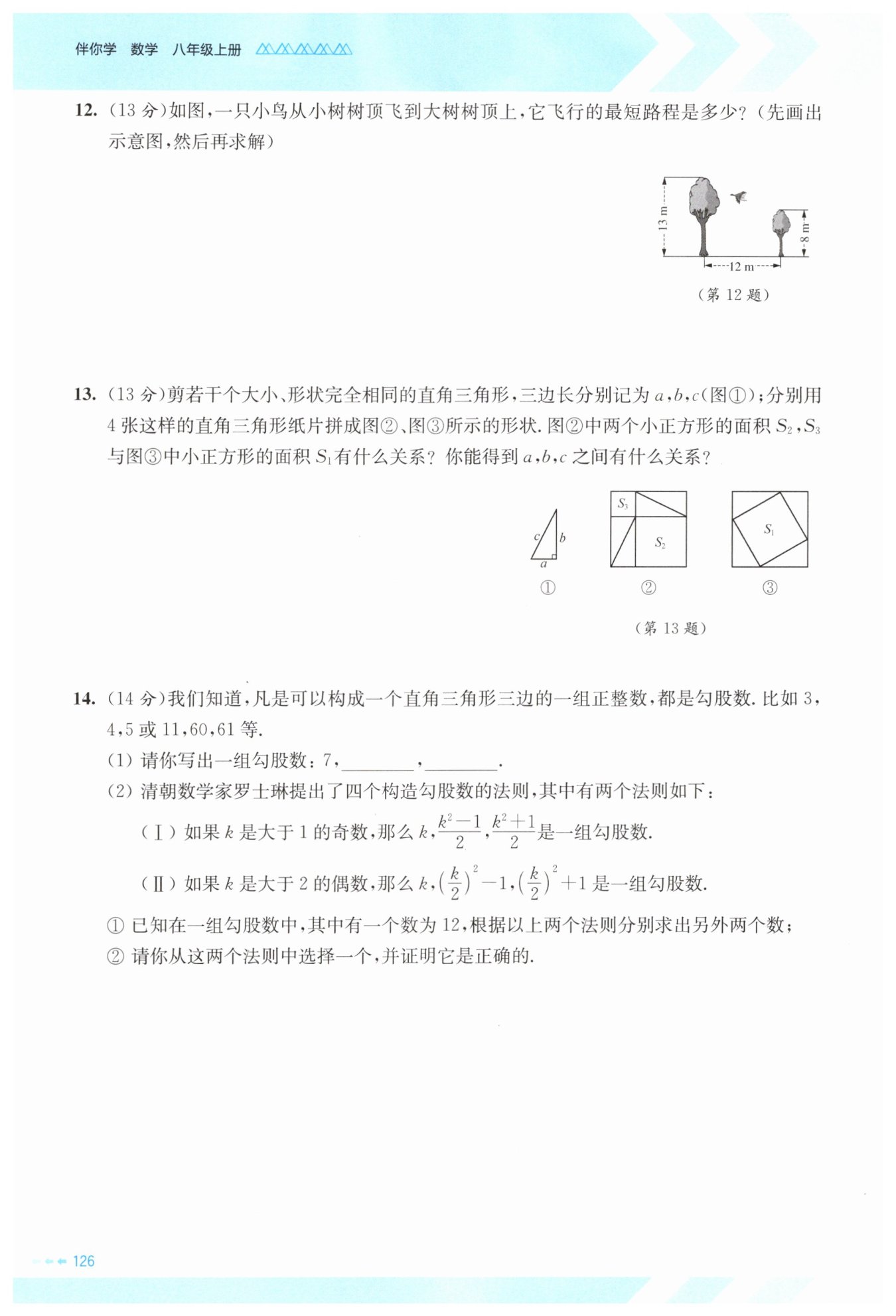 (說明:$AB$為大樹,高度$AB=13\,\text{m};$$CE$為小樹,高度$CE=8\,\text{m};$兩樹水平距離$BE=12\,\text{m},$過$C$作$CD \perp AB$于$D,$則$CD=BE=12\,\text{m},$$AD=AB-CE=13-8=5\,\text{m},$$AC$為小鳥飛行的最短路程。)