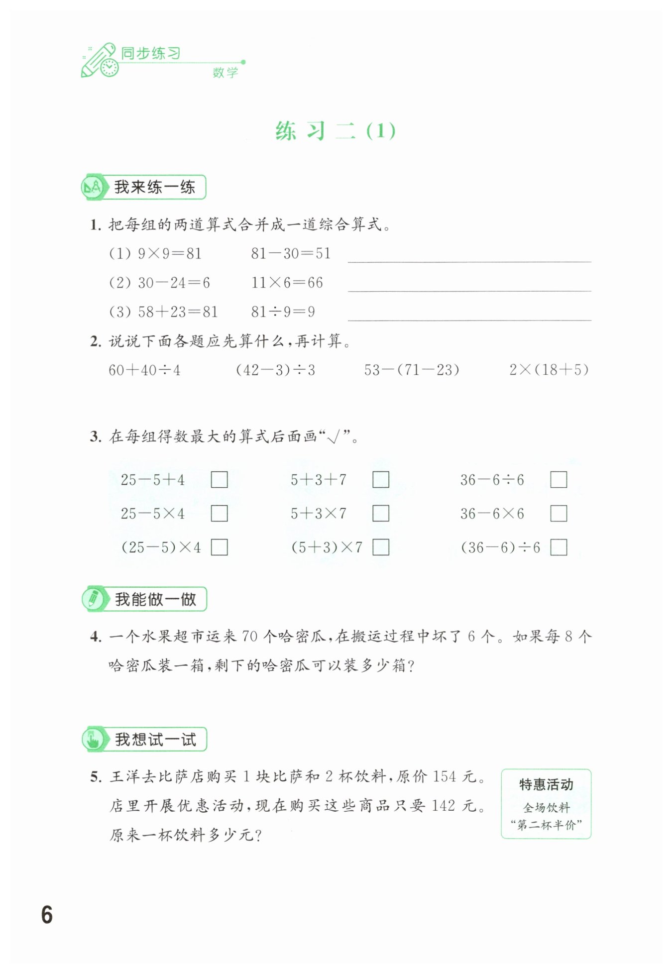 (1) 根據(jù)第一步算式 $9 × 9 = 81$,然后將結(jié)果用于第二步 $81 - 30 = 51$,因此可以合并成綜合算式 $9 × 9 - 30 = 51$。