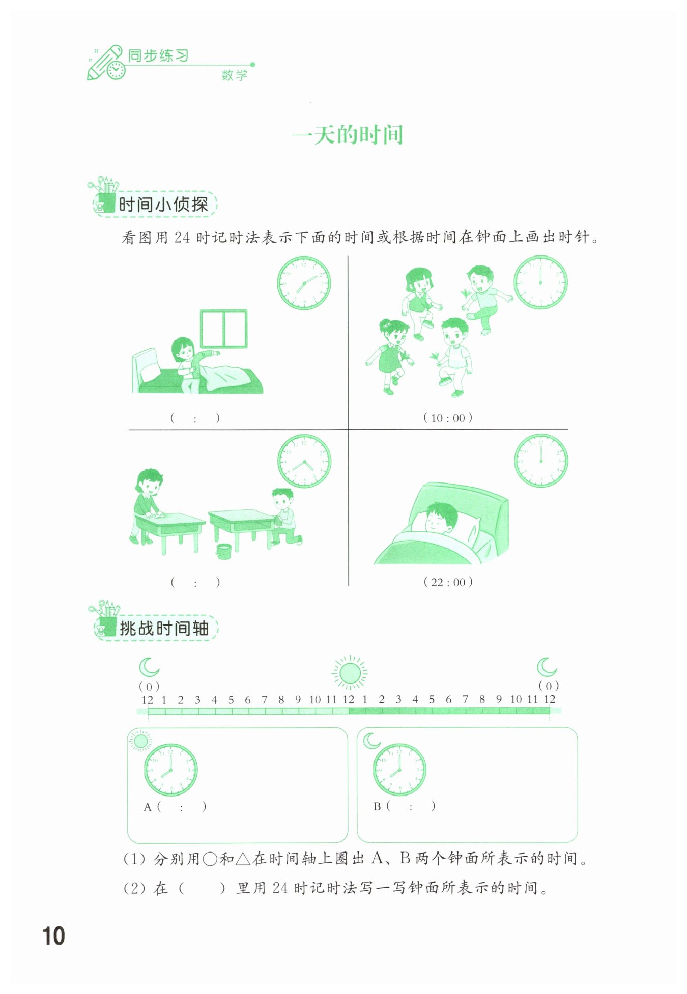(1) A鐘面時(shí)針指向8,分針指向12,是8:00,在時(shí)間軸上午8時(shí)位置畫○;B鐘面時(shí)針指向8,分針指向12,有月亮圖標(biāo)是晚上8時(shí),即20:00,在時(shí)間軸上20時(shí)位置畫△。