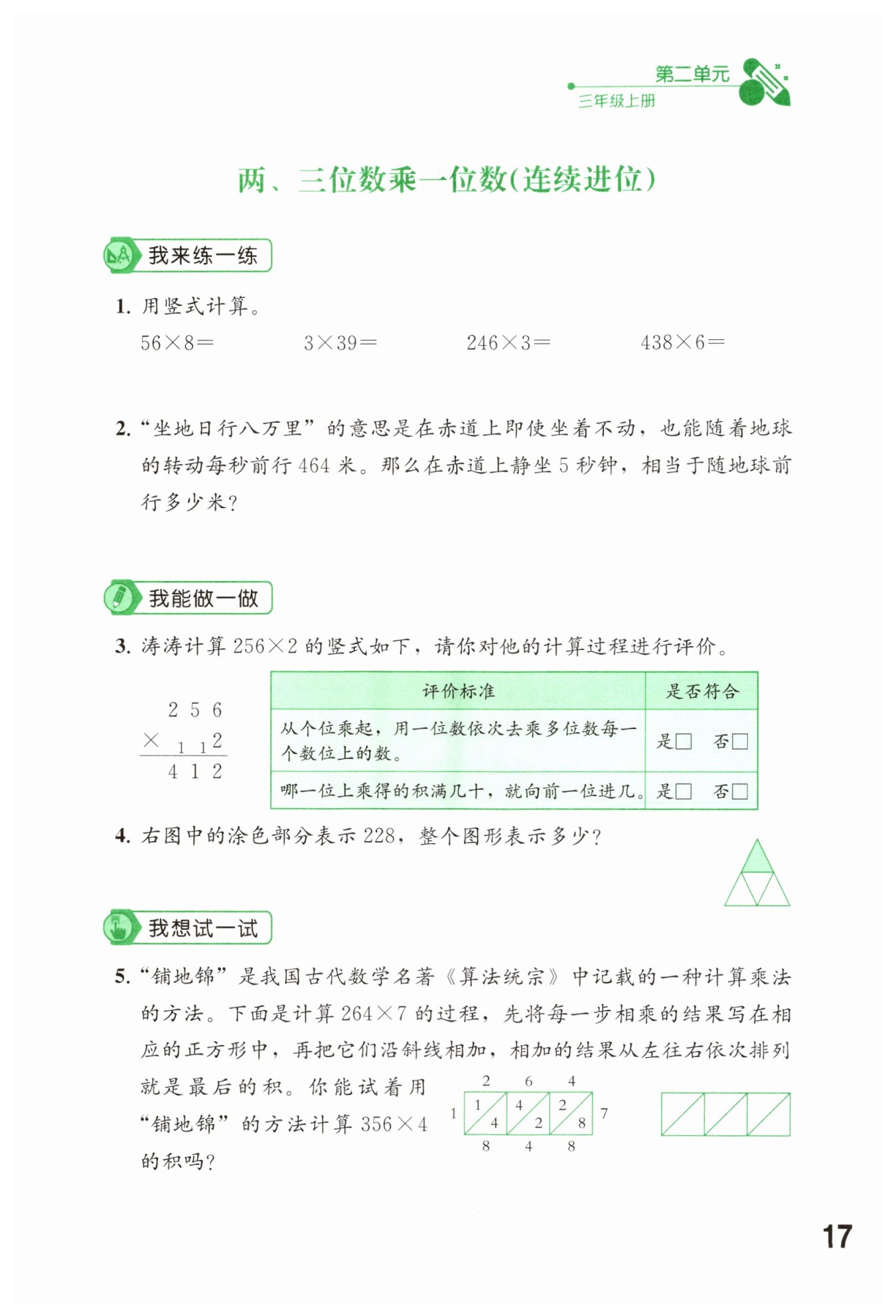 1. 濤濤的計(jì)算從個(gè)位6×2=12,寫2進(jìn)1;再算十位5×2=10,加上進(jìn)位1得11,寫1進(jìn)1;最后算百位2×2=4,加上進(jìn)位1得5,正確結(jié)果應(yīng)為512,而豎式結(jié)果為412,說明百位計(jì)算錯(cuò)誤,但計(jì)算順序是從個(gè)位乘起,依次乘每一位數(shù),符合第一個(gè)標(biāo)準(zhǔn)。