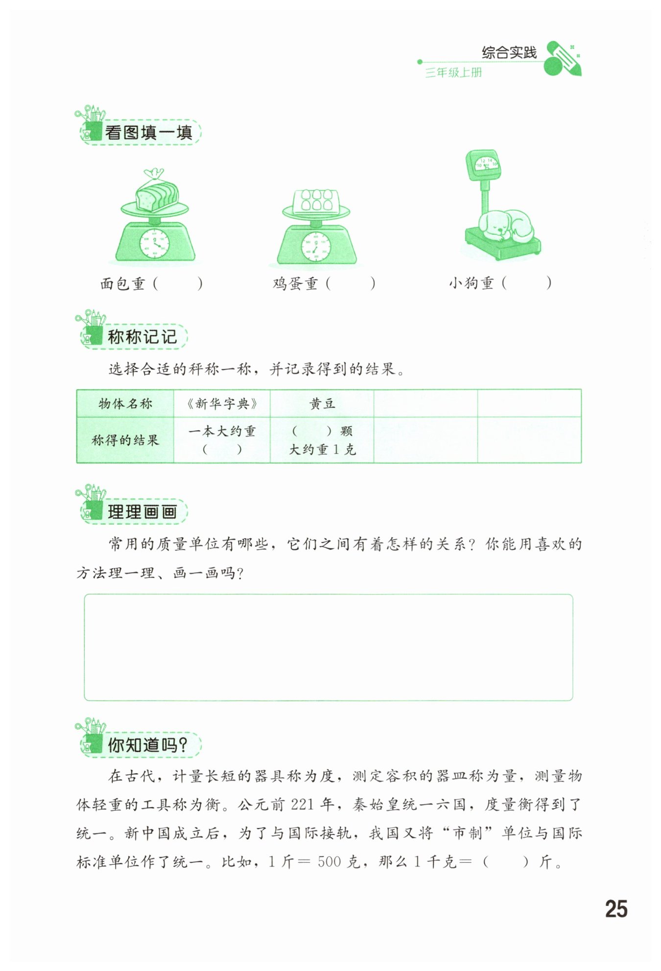用秤稱量一本《新華字典》大約重280克(結(jié)果可能因字典版本等因素有所不同,以實(shí)際稱量為準(zhǔn),這里以常見大致重量舉例),通過稱量可知大約5粒黃豆重1克。