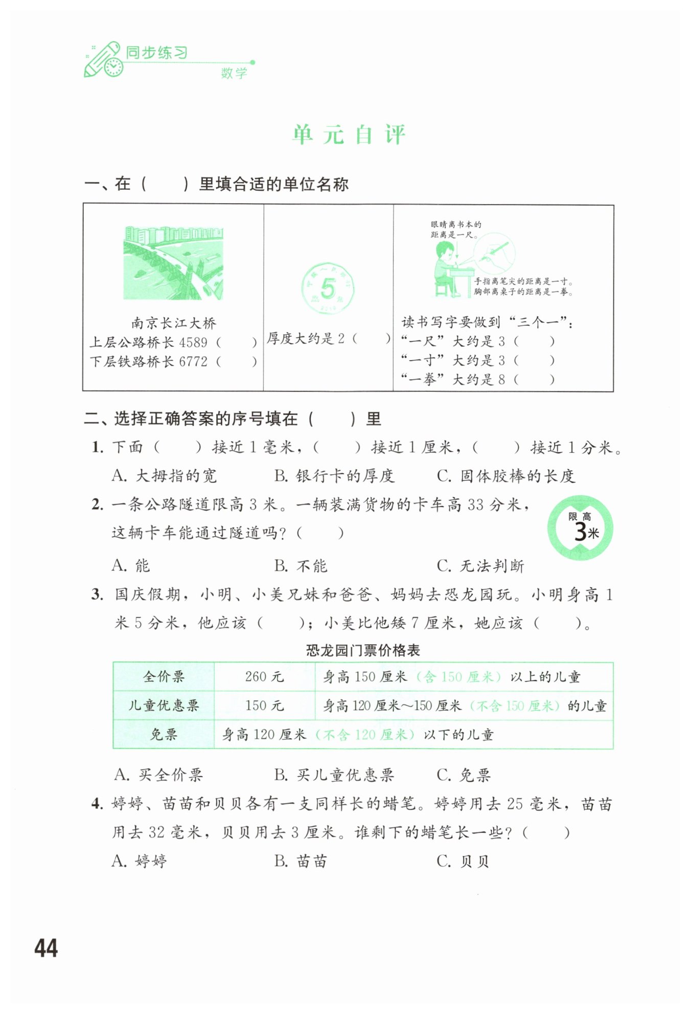 南京長江大橋長度較長,用“米”作單位;5角硬幣厚度較薄,用“毫米”作單位;“三個(gè)一”中,“一尺”約33厘米即3分米,“一寸”約3厘米,“一拳”約8厘米。