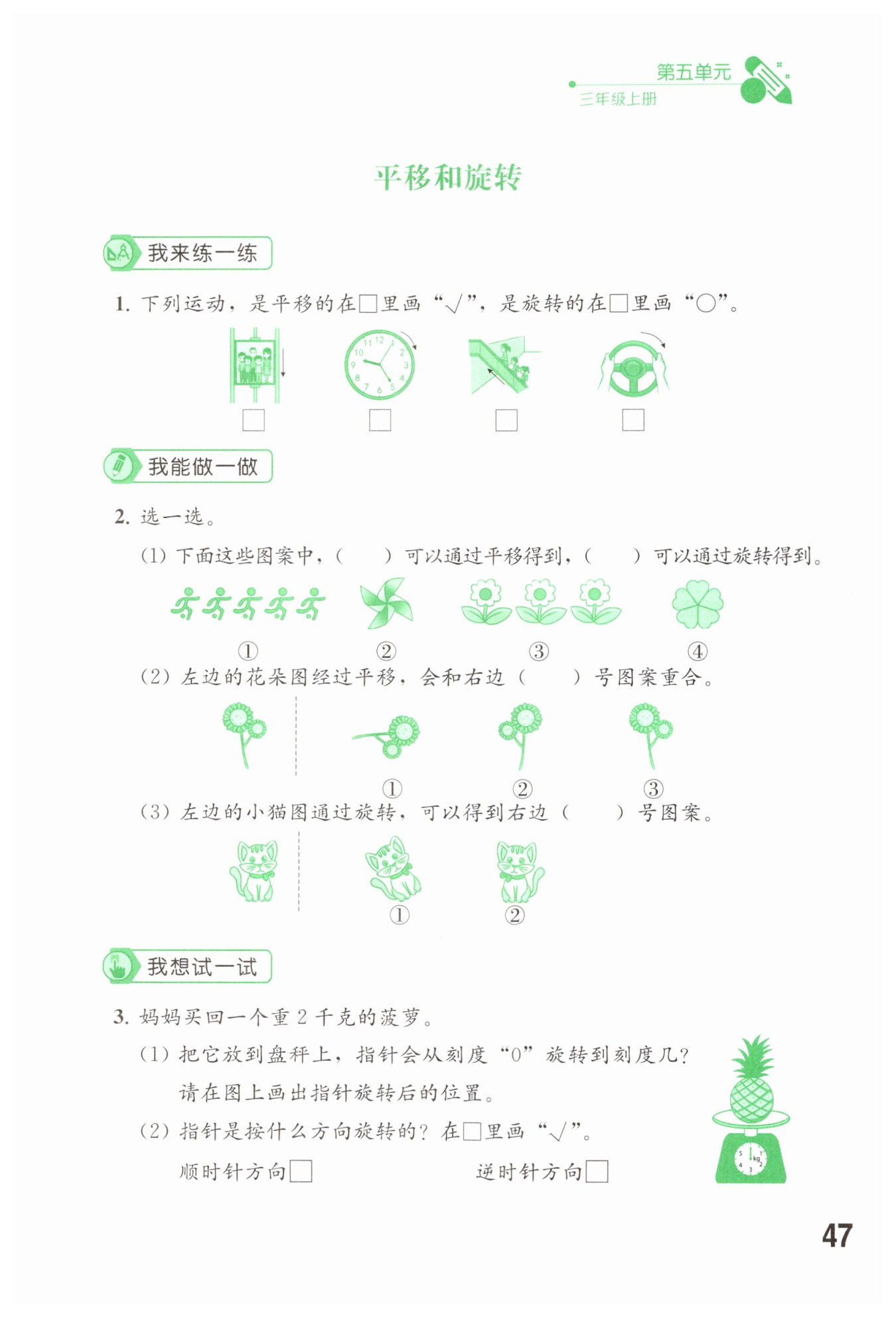 (3)旋轉(zhuǎn)改變圖形方向,左邊小貓圖旋轉(zhuǎn)后與①號(hào)圖案方向相符。