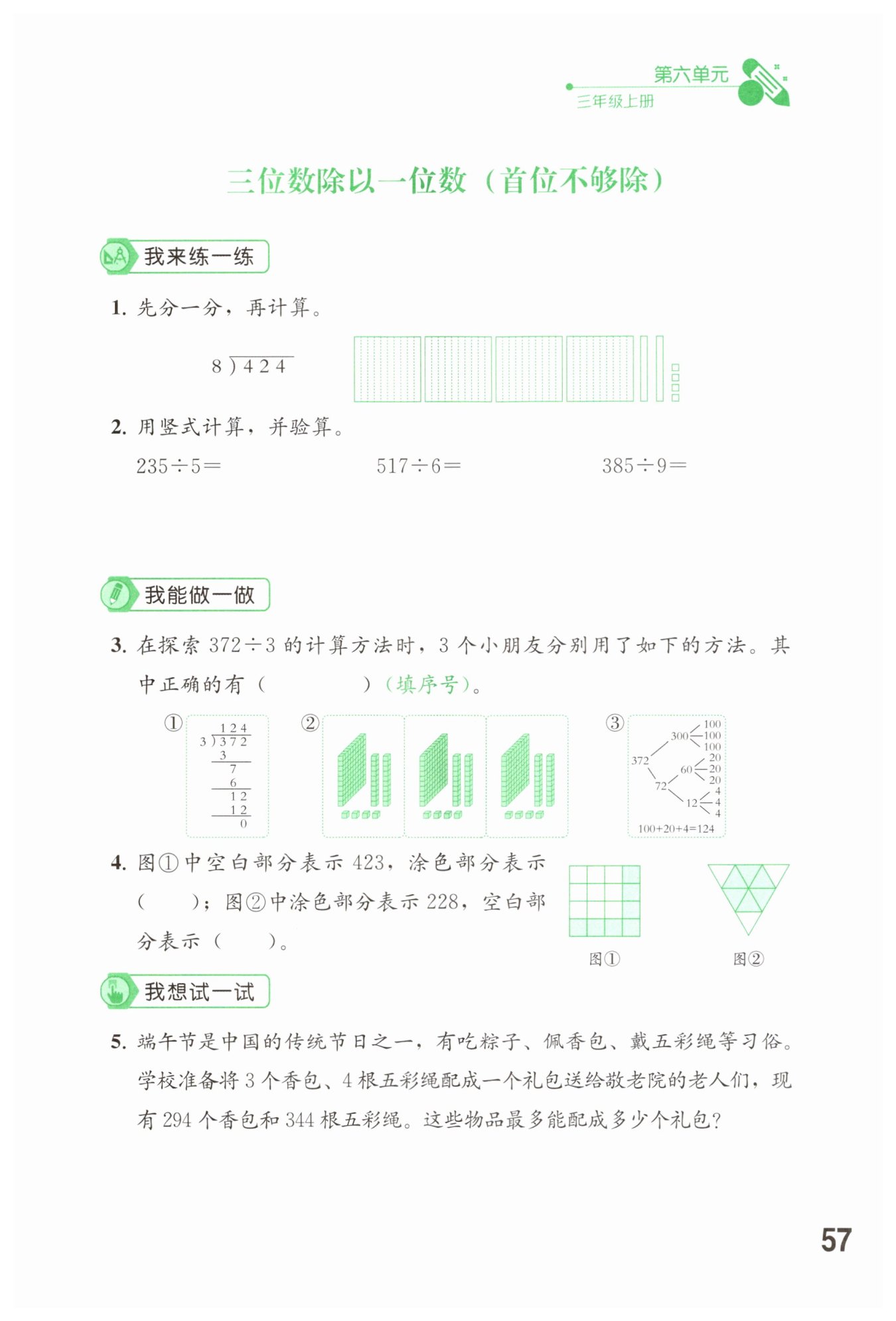 方法③通過拆分被除數(shù),將 372 拆分為 300、70+2 后分別除以 3,再相加,計(jì)算無誤,結(jié)果正確。