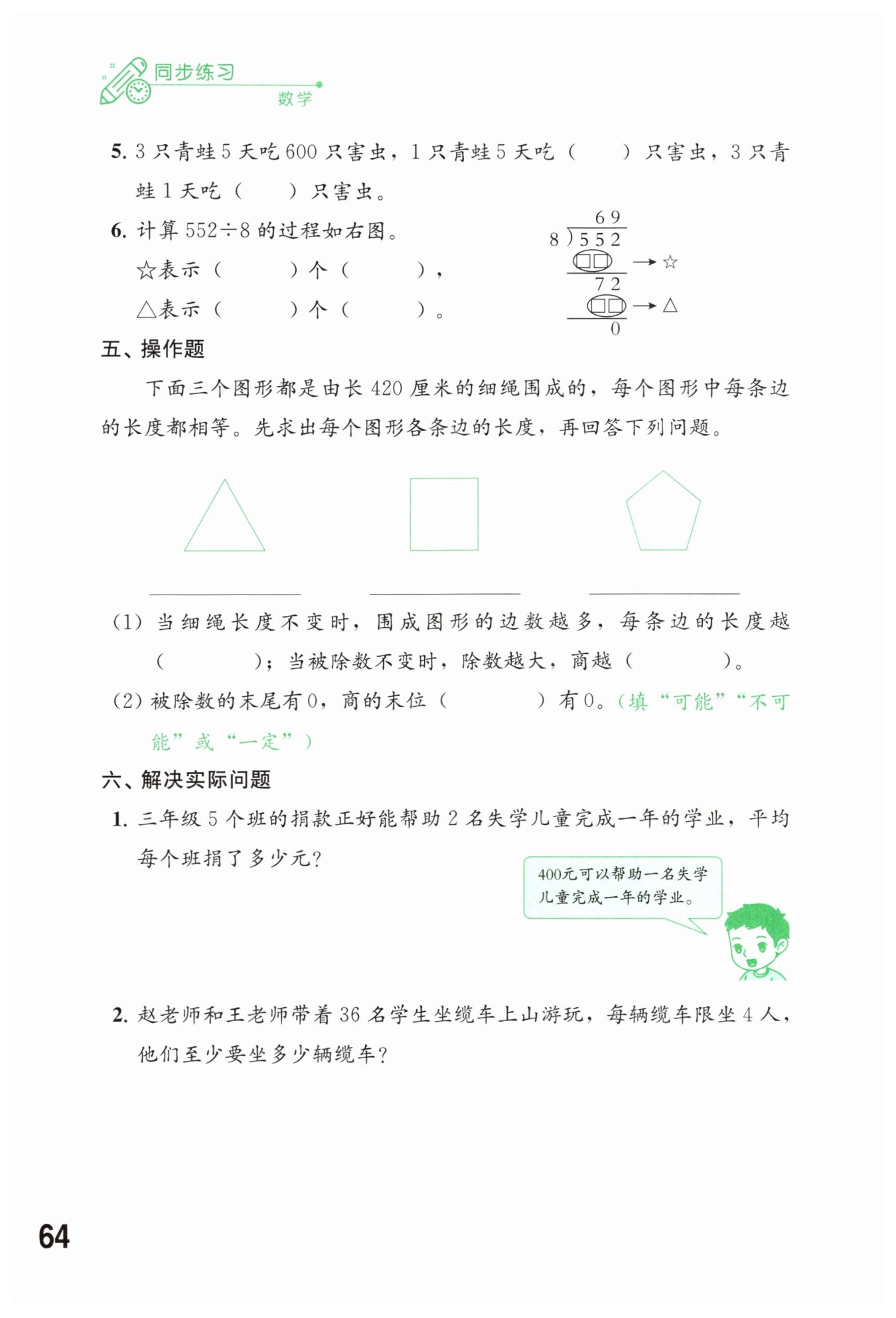 (1) 已知3只青蛙5天吃600只害蟲,要求1只青蛙5天吃多少只害蟲,可將總害蟲數(shù)平均分配給3只青蛙,即$600÷3 = 200$(只)。
