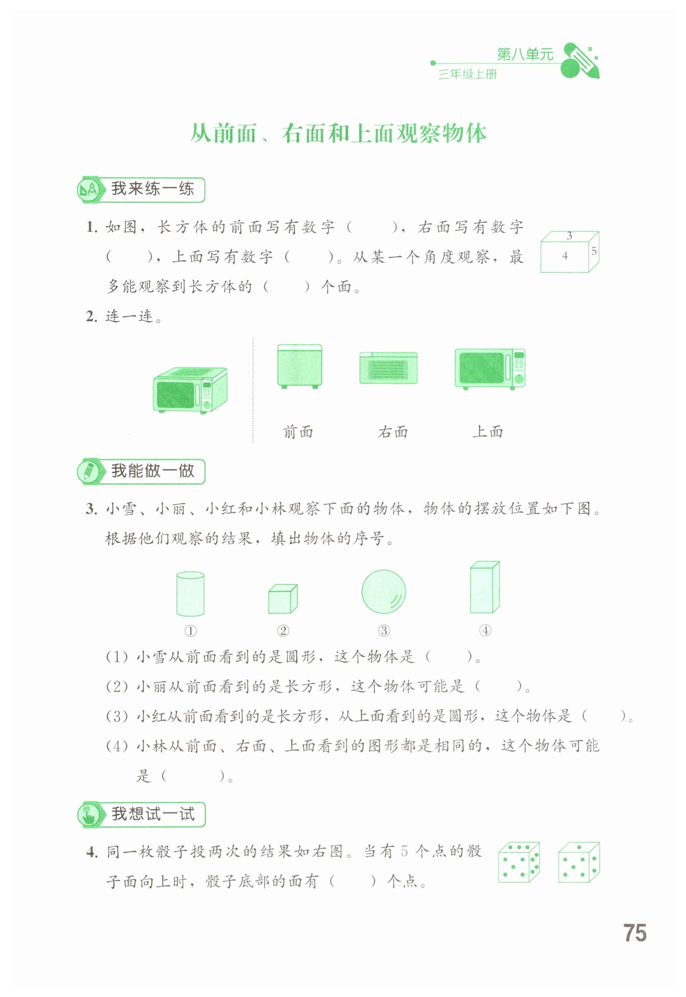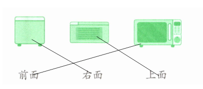 從前面觀察微波爐,能看到帶有門和控制面板的正面;從右面觀察,看到的是微波爐較窄的側(cè)面,有凸起的部分;從上面觀察,看到的是微波爐的頂部。據(jù)此連線:第一個圖形連右面,第二個圖形連上面,第三個圖形連前面。