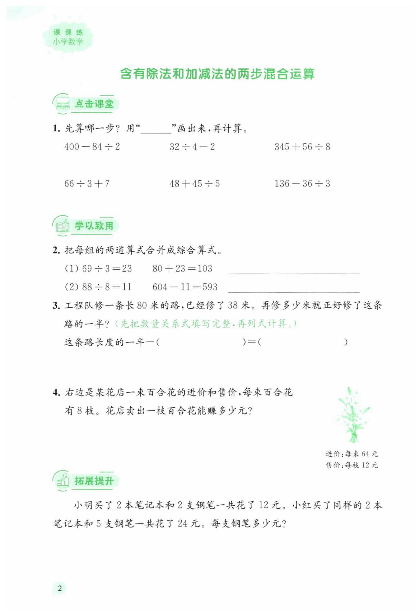 首先,計算每枝百合花的進價:每束進價64元,每束有8枝,每枝進價$=64\div8 = 8$(元)。然后,計算每枝百合花的利潤:每枝售價12元,每枝利潤$=12 - 8=4$(元)。答:花店賣出一枝百合花能賺4元。