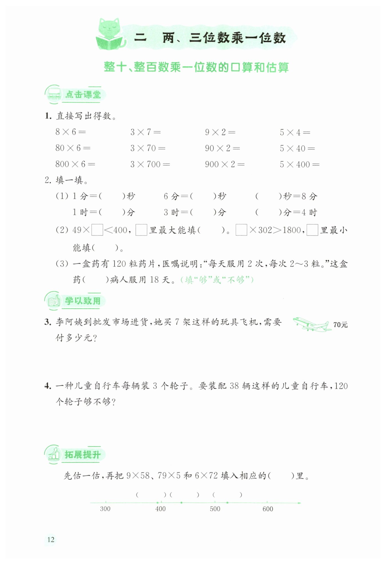 對于$80×6$,因為$80$是$8$個十,$8$個十乘$6$得$48$個十,也就是$480$;同理$3×70$,$3$乘$7$個十得$21$個十,即$210$;$90×2$,$9$個十乘$2$得$18$個十,即$180$;$5×40$,$5$乘$4$個十得$20$個十,即$200$。