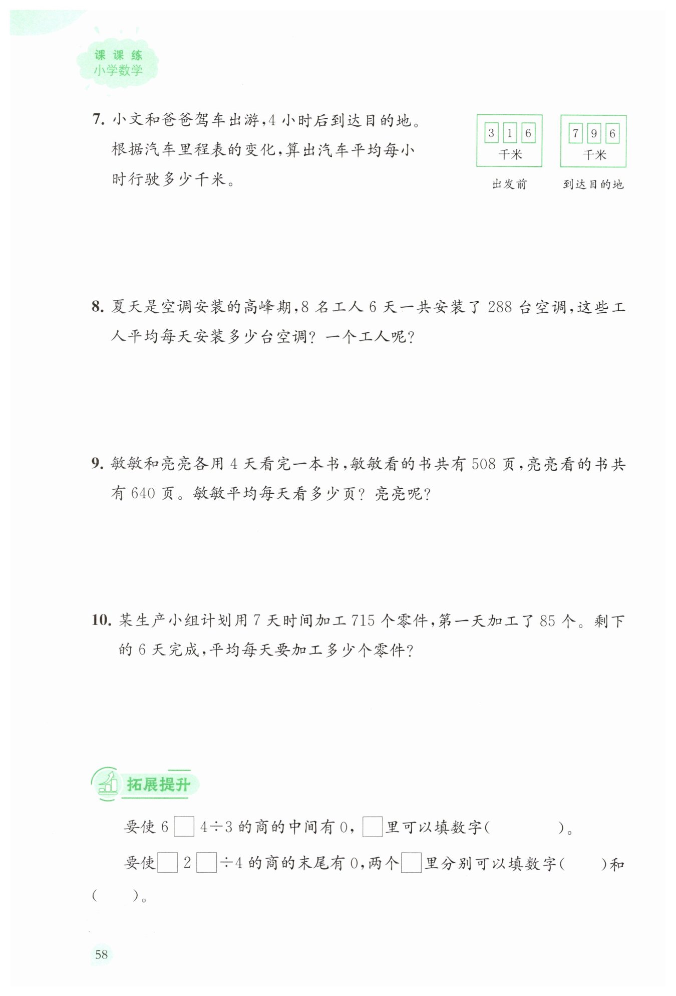 第一題:6□4÷3,百位6÷3=2無(wú)余數(shù),要使商中間有0,十位□需小于3,故□可填0、1、2。第二題:□2□÷4商末尾有0,需前兩位□2能被4整除(□可為1、3、5、7、9)且個(gè)位□<4(可為0、1、2、3),例如百位填1,個(gè)位填0。