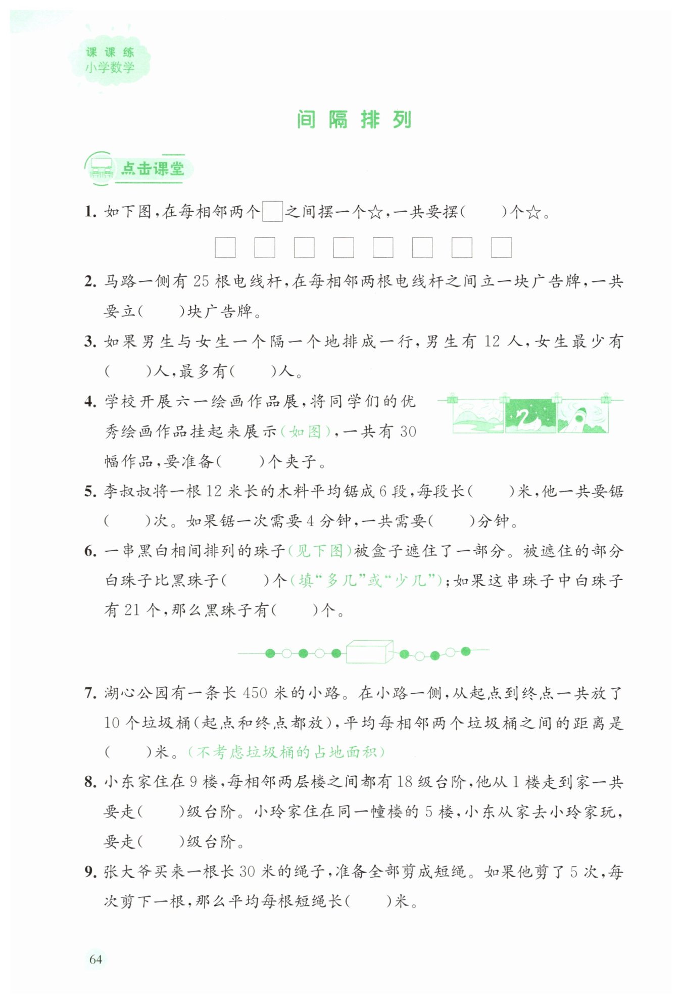 觀察插圖可知,作品與夾子間隔排列,夾子在兩端。1幅作品需要2個夾子,2幅作品需要3個夾子,3幅作品需要4個夾子,規(guī)律為夾子數比作品數多1。所以30幅作品需要30+1=31個夾子。
