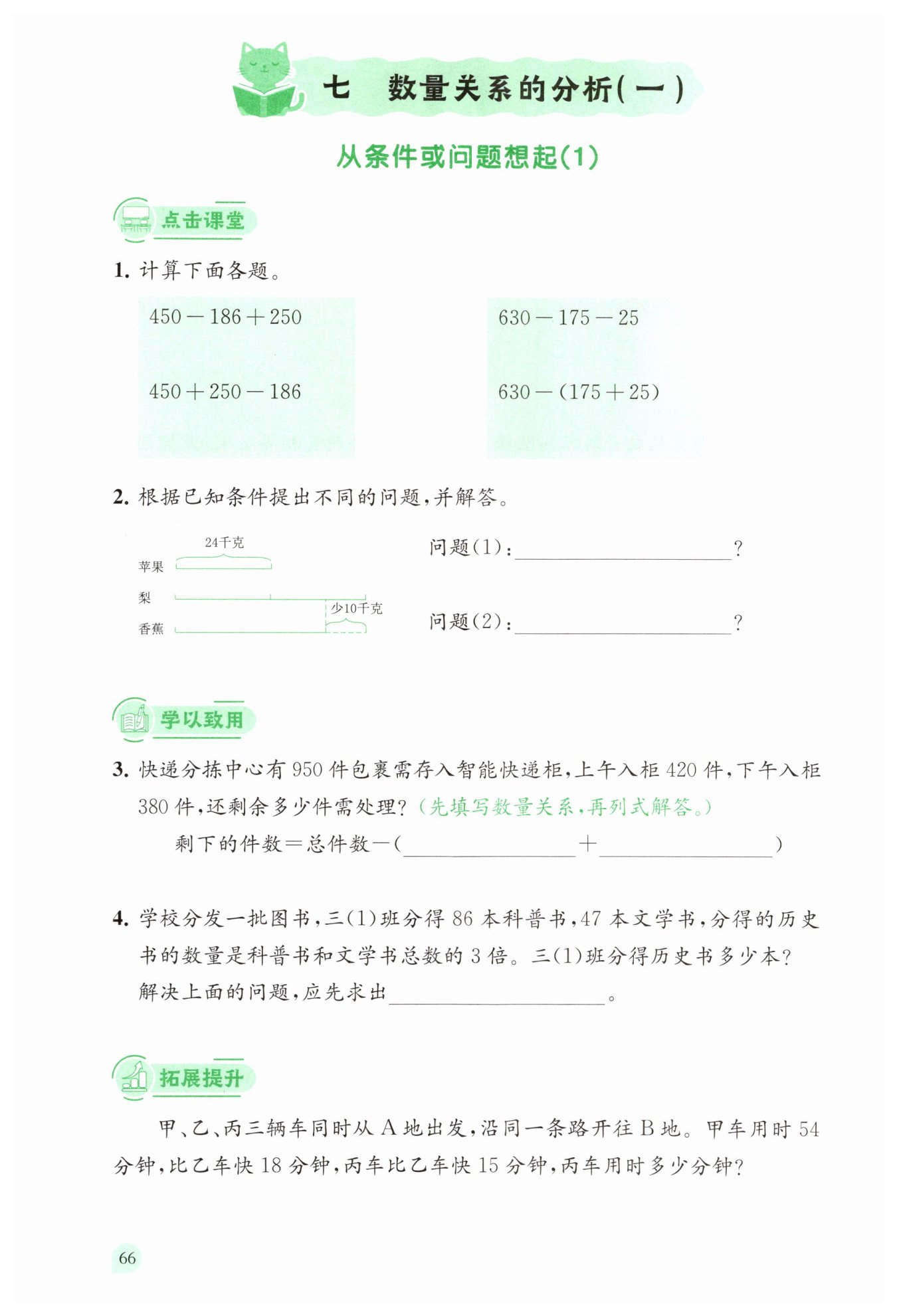 答:應(yīng)先求出科普書和文學(xué)書的總數(shù),三(1)班分得歷史書 399 本。