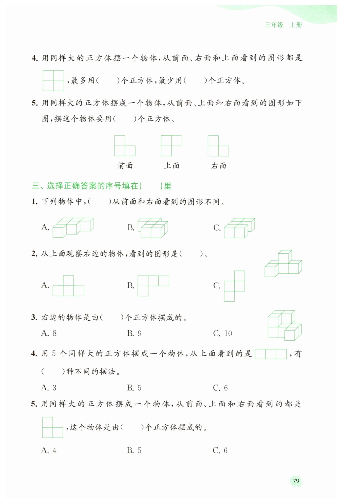 1. 2個(gè)正方體放在同一個(gè)底層正方體上:有3種擺法(分別放在左、中、右3個(gè)底層正方體上)。