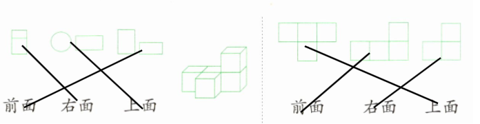 左邊:前面連第三個(gè)圖形,右面連第一個(gè)圖形,上面連第二個(gè)圖形;右邊:前面連第二個(gè)圖形,右面連第三個(gè)圖形,上面連第一個(gè)圖形。